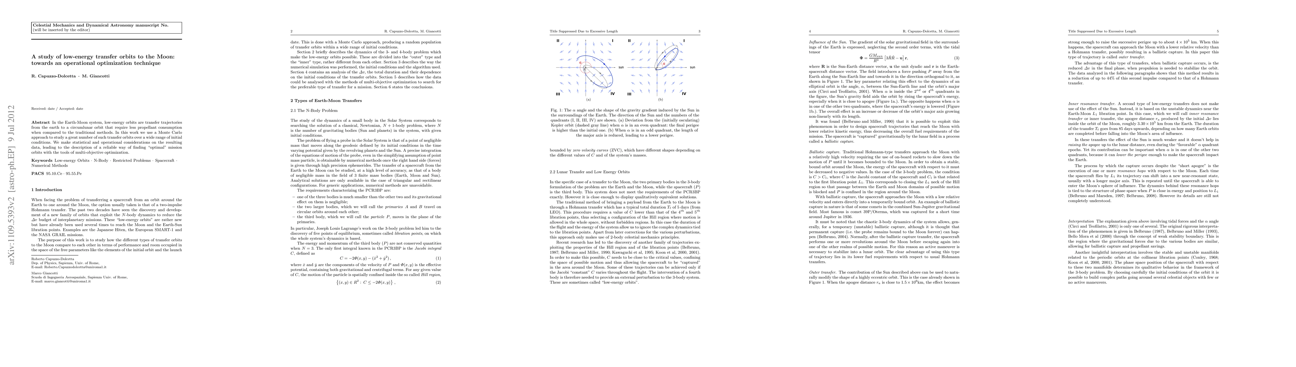 This study investigates low-energy transfer orbits to the Moon using a Monte Carlo approach, aiming to optimize propellant consumption. The research develops a multi-objective optimization technique to identify optimal mission orbits based on statistical analysis of numerous transfer scenarios.