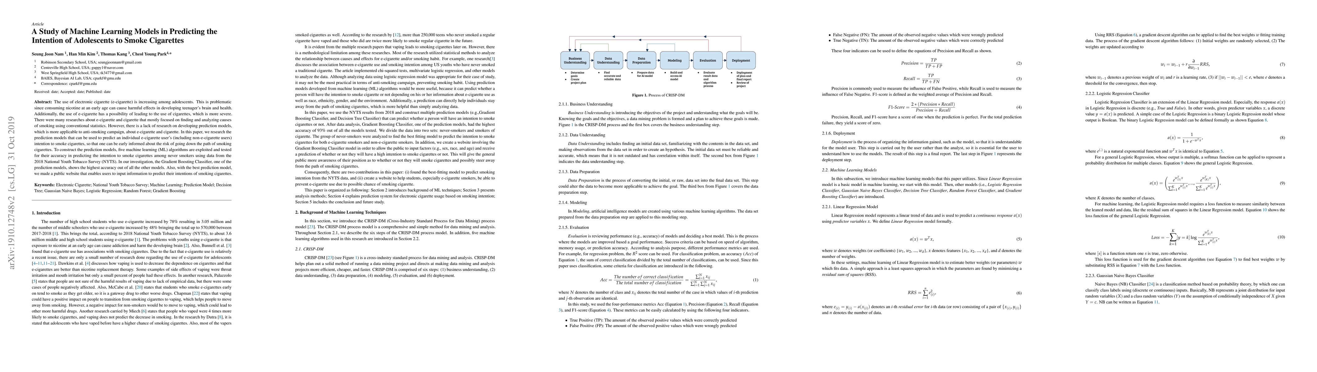The use of electronic cigarette (e-cigarette) is increasing among adolescents. This is problematic since consuming nicotine at an early age can cause harmful effects in developing teenager's brain and health. Additionally, the use of e-cigarette has a possibility of leading to the use of cigarettes, which is more severe. There were many researches about e-cigarette and cigarette that mostly focused on finding and analyzing causes of smoking using conventional statistics. However, there is a lack of research on developing prediction models, which is more applicable to anti-smoking campaign, about e-cigarette and cigarette. In this paper, we research the prediction models that can be used to predict an individual e-cigarette user's (including non-e-cigarette users) intention to smoke cigarettes, so that one can be early informed about the risk of going down the path of smoking cigarettes. To construct the prediction models, five machine learning (ML) algorithms are exploited and tested for their accuracy in predicting the intention to smoke cigarettes among never smokers using data from the 2018 National Youth Tobacco Survey (NYTS). In our investigation, the Gradient Boosting Classifier, one of the prediction models, shows the highest accuracy out of all the other models. Also, with the best prediction model, we made a public website that enables users to input information to predict their intentions of smoking cigarettes.