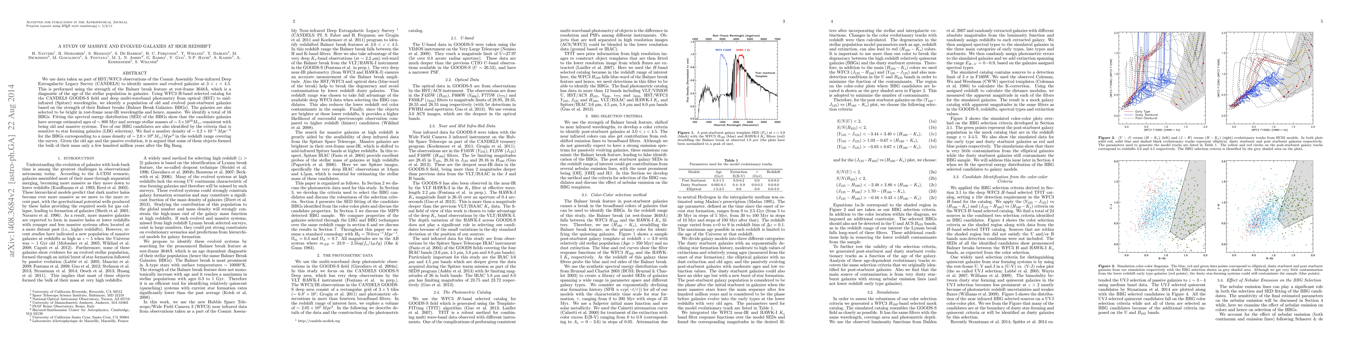 This study identifies massive and evolved galaxies at high redshift (3<z<4.5) using HST/WFC3 observations from the CANDELS survey, focusing on Balmer Break Galaxies (BBGs) indicative of old stellar populations. The research finds a population of 16 BBGs with estimated ages of ~800 Myr and stellar masses of ~5x10^10 M_sun, suggesting they formed early in the universe's history.