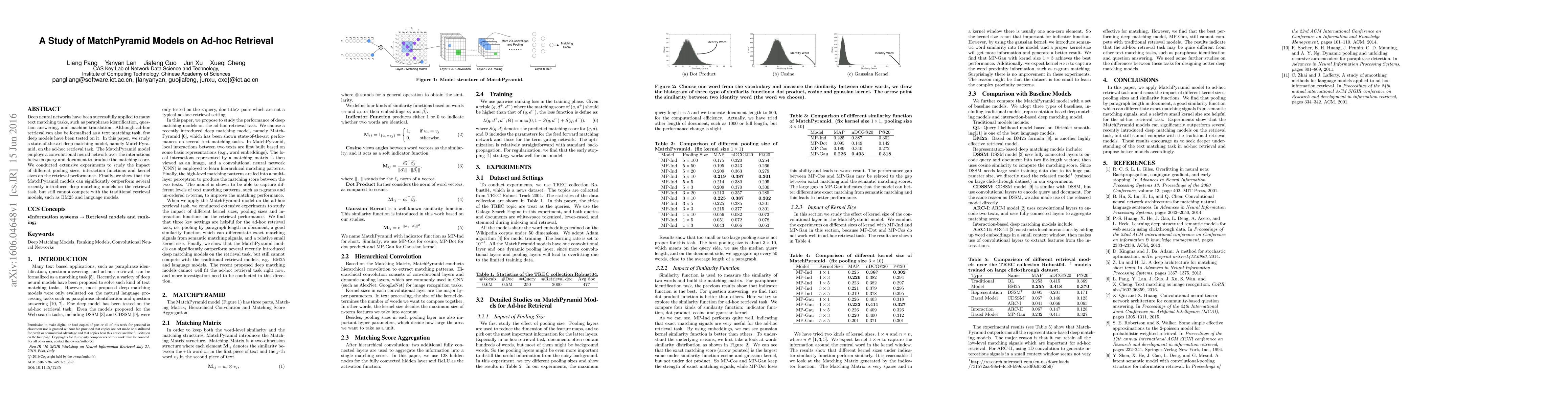 This study explores the MatchPyramid deep matching model for ad-hoc retrieval, demonstrating its effectiveness compared to other deep models but noting its limitations against traditional retrieval methods like BM25. Experiments highlight the influence of pooling sizes, interaction functions, and kernel sizes on performance.