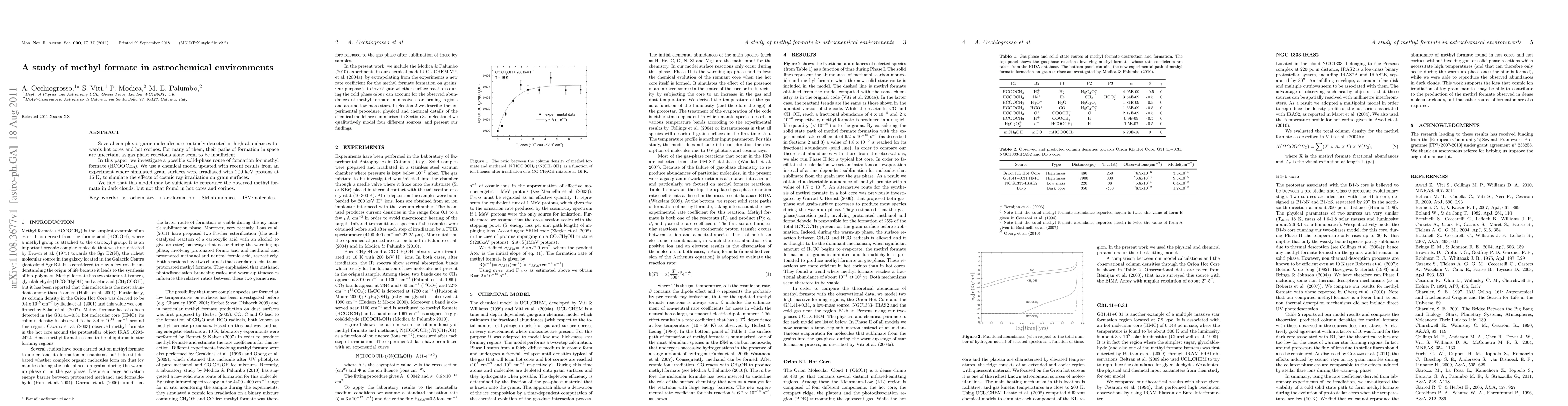 This study explores a solid-phase route for methyl formate formation in astrochemical environments, using a chemical model updated with experimental data on cosmic ray irradiation effects. The model can reproduce methyl formate in dark clouds but not in hot cores and corinos.