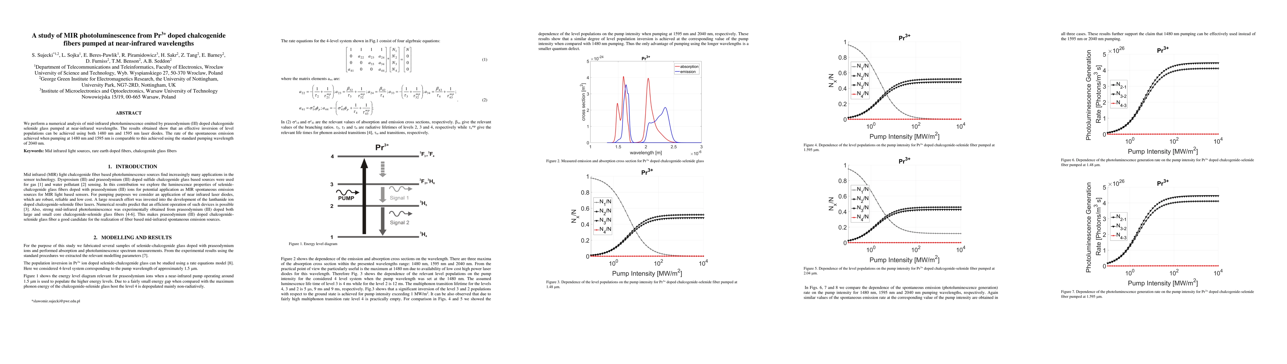 We perform a numerical analysis of mid-infrared photoluminescence emitted by praseodymium (III) doped chalcogenide selenide glass pumped at near-infrared wavelengths. The results obtained show that an effective inversion of level populations can be achieved using both 1480 nm and 1595 nm laser diodes. The rate of the spontaneous emission achieved when pumping at 1480 nm and 1595 nm is comparable to this achieved using the standard pumping wavelength of 2040 nm.