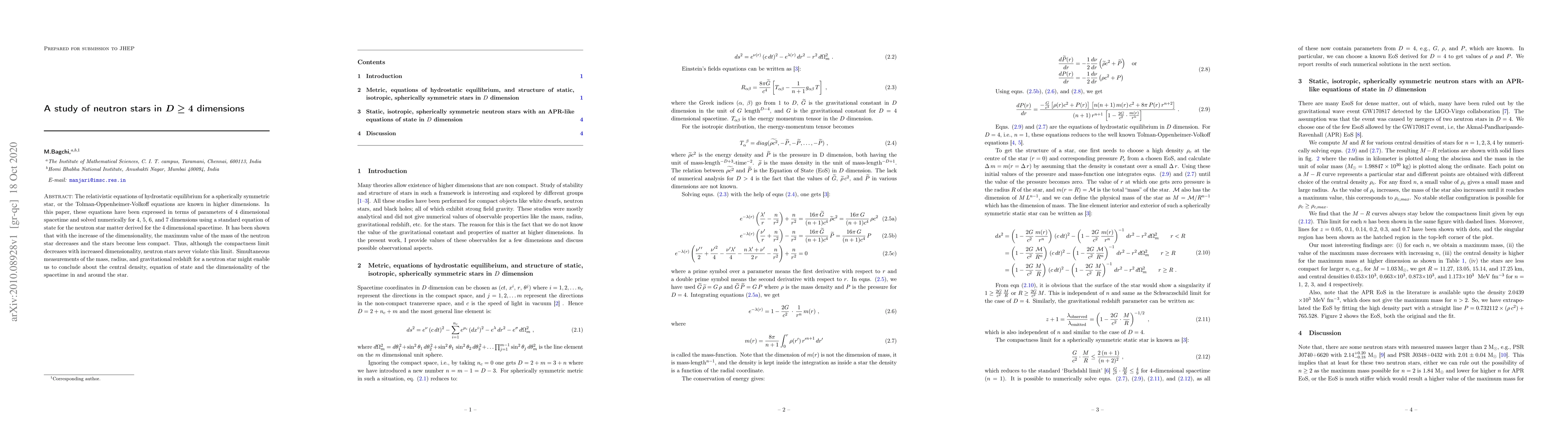 The relativistic equations of hydrostatic equilibrium for a spherically symmetric star, or the Tolman-Oppenheimer-Volkoff equations are known in higher dimensions. In this paper, these equations have been expressed in terms of parameters of 4 dimensional spacetime and solved numerically for 4, 5, 6, and 7 dimensions using a standard equation of state for the neutron star matter derived for the 4 dimensional spacetime. It has been shown that with the increase of the dimensionality, the maximum value of the mass of the neutron star decreases and the stars become less compact. Thus, although the compactness limit decreases with increased dimensionality, neutron stars never violate this limit. Simultaneous measurements of the mass, radius, and gravitational redshift for a neutron star might enable us to conclude about the central density, equation of state and the dimensionality of the spacetime in and around the star.