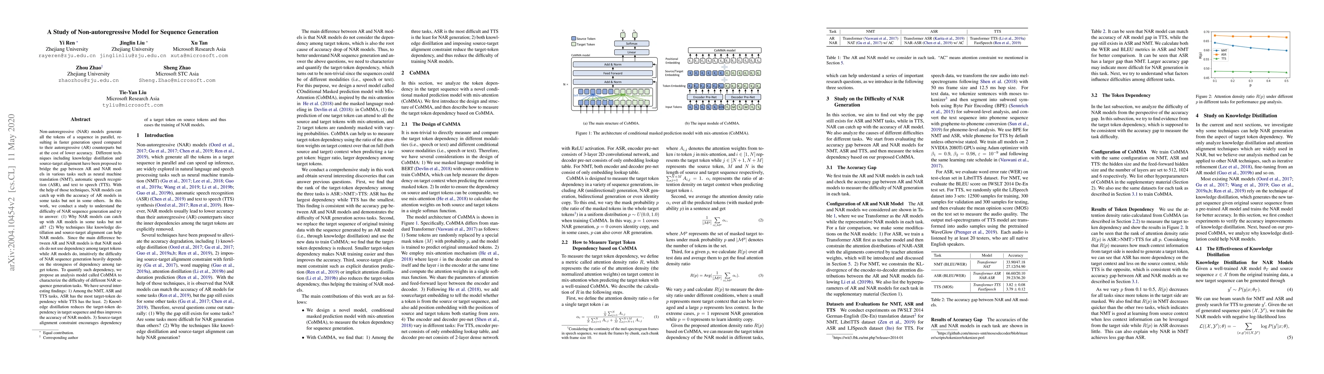 This study investigates the performance of non-autoregressive (NAR) models for sequence generation compared to autoregressive (AR) models, proposing CoMMA to quantify target-token dependency. Findings reveal that ASR tasks have the highest dependency, while TTS has the least, and techniques like knowledge distillation and source-target alignment help improve NAR model accuracy by reducing or aligning target-token dependencies.