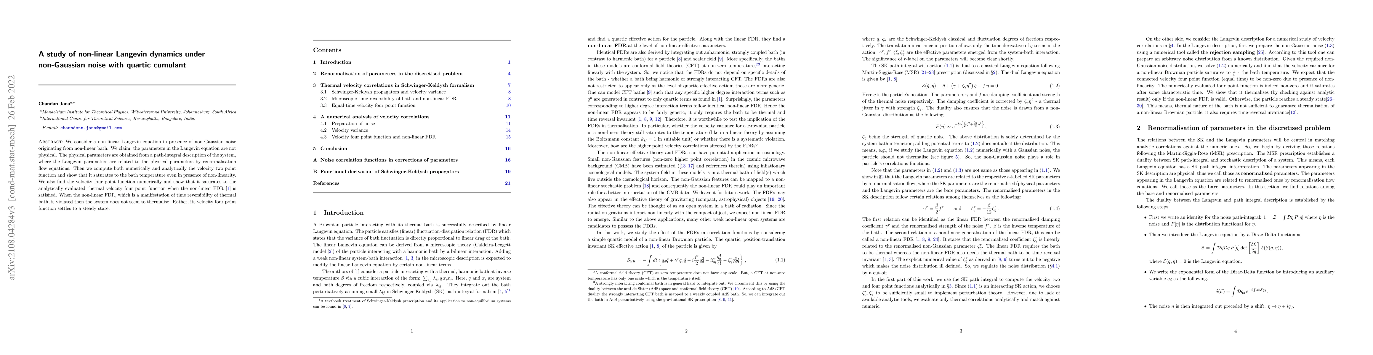 This study explores non-linear Langevin dynamics under non-Gaussian noise with quartic cumulant, demonstrating that physical parameters are derived from path-integral descriptions, unrelated Langevin parameters linked via renormalisation flow equations. Numerical and analytical computations reveal velocity two-point function saturation at bath temperature, and velocity four-point function saturation when non-linear Fluctuation-Dissipation Relation (FDR) holds, indicating thermalisation. However, violation of non-linear FDR, signifying non-time-reversible thermal bath, results in steady-state velocity four-point function instead of thermalisation.