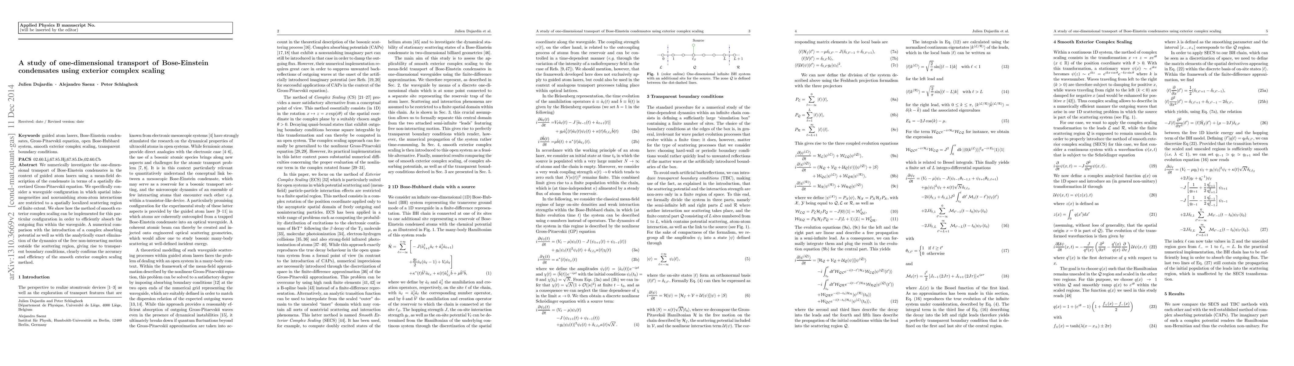 This study numerically explores the one-dimensional transport of Bose-Einstein condensates in waveguides using exterior complex scaling to absorb outgoing flux. The method is shown to be accurate and efficient compared to other techniques, confirming its effectiveness for guided atom lasers.