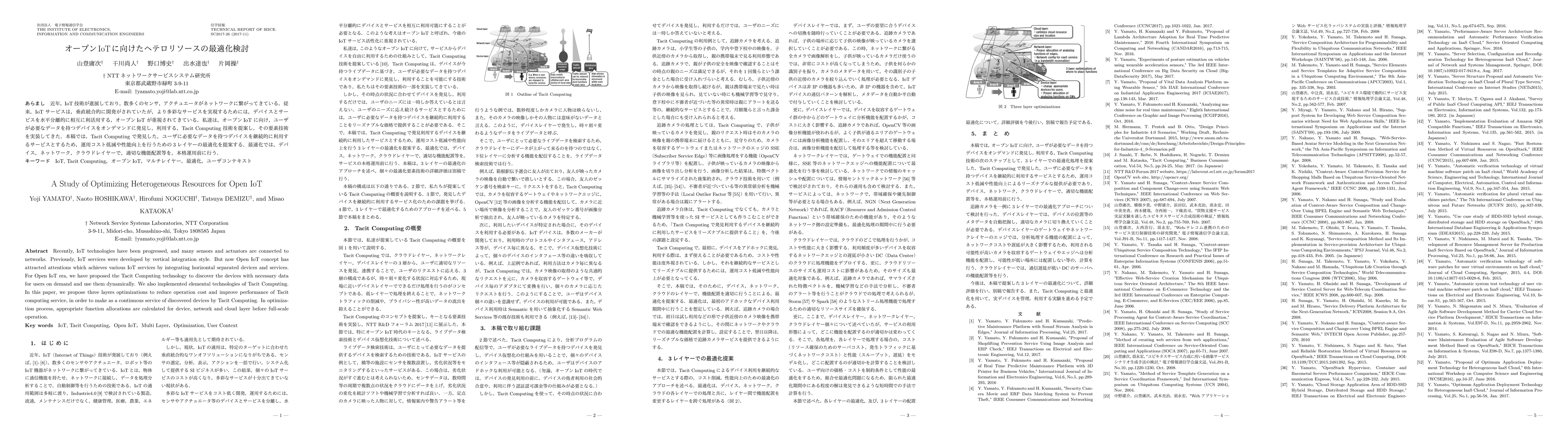Recently, IoT technologies have been progressed, and many sensors and actuators are connected to networks. Previously, IoT services were developed by vertical integration style. But now Open IoT concept has attracted attentions which achieves various IoT services by integrating horizontal separated devices and services. For Open IoT era, we have proposed the Tacit Computing technology to discover the devices with necessary data for users on demand and use them dynamically. We also implemented elemental technologies of Tacit Computing. In this paper, we propose three layers optimizations to reduce operation cost and improve performance of Tacit computing service, in order to make as a continuous service of discovered devices by Tacit Computing. In optimization process, appropriate function allocations are calculated for device, network and cloud layer before full-scale operation.