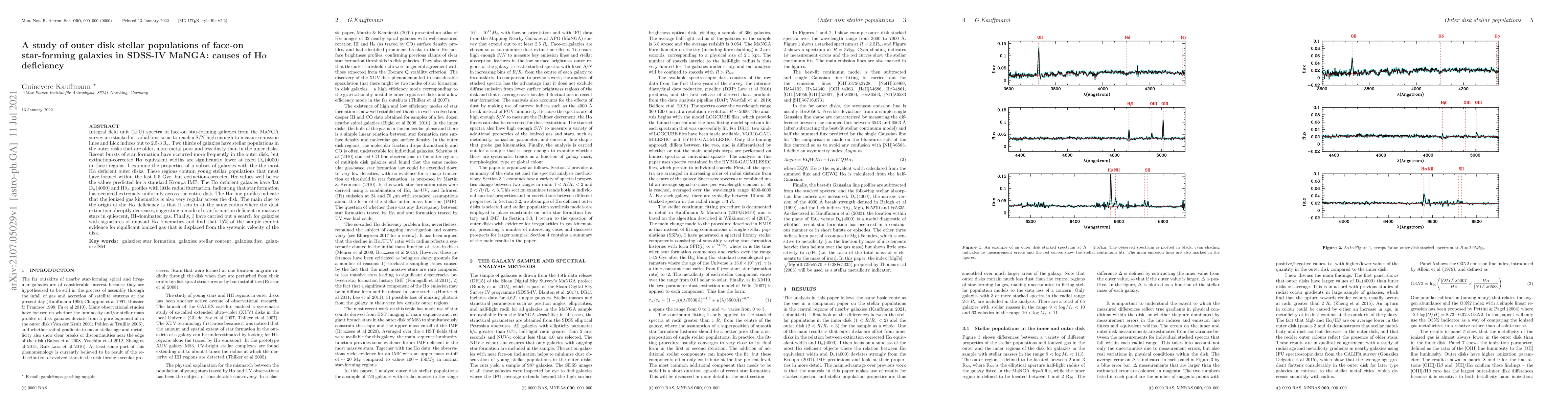 Integral field unit (IFU) spectra of face-on star-forming galaxies from the MaNGA survey are stacked in radial bins so as to reach a S/N high enough to measure emission lines and Lick indices out to 2.5-3 R_e. Two thirds of galaxies have stellar populations in the outer disks that are older, more metal poor and less dusty than in the inner disks. Recent bursts of star formation have occurred more frequently in the outer disk, but extinction-corrected Halpha equivalent widths are significantly lower at fixed D_n(4000) in these regions. I examine the properties of a subset of galaxies with the the most H$\alpha$ deficient outer disks. These regions contain young stellar populations that must have formed within the last 0.5 Gyr, but extinction-corrected Halpha values well below the values predicted for a standard Kroupa IMF. The Halpha deficient galaxies have flat D_n(4000) and Hdelta_A profiles with little radial fluctuation, indicating that star formation has occurred extremely uniformly across the entire disk. The H$\alpha$ line profiles indicate that the ionized gas kinematics is also very regular across the disk. The main clue to the origin of the Halpha deficiency is that it sets in at the same radius where the dust extinction abruptly decreases, suggesting a mode of star formation deficient in massive stars in quiescent, HI-dominated gas. Finally, I have carried out a search for galaxies with signatures of unusual Halpha kinematics and find that 15% of the sample exhibit evidence for significant ionized gas that is displaced from the systemic velocity of the disk.