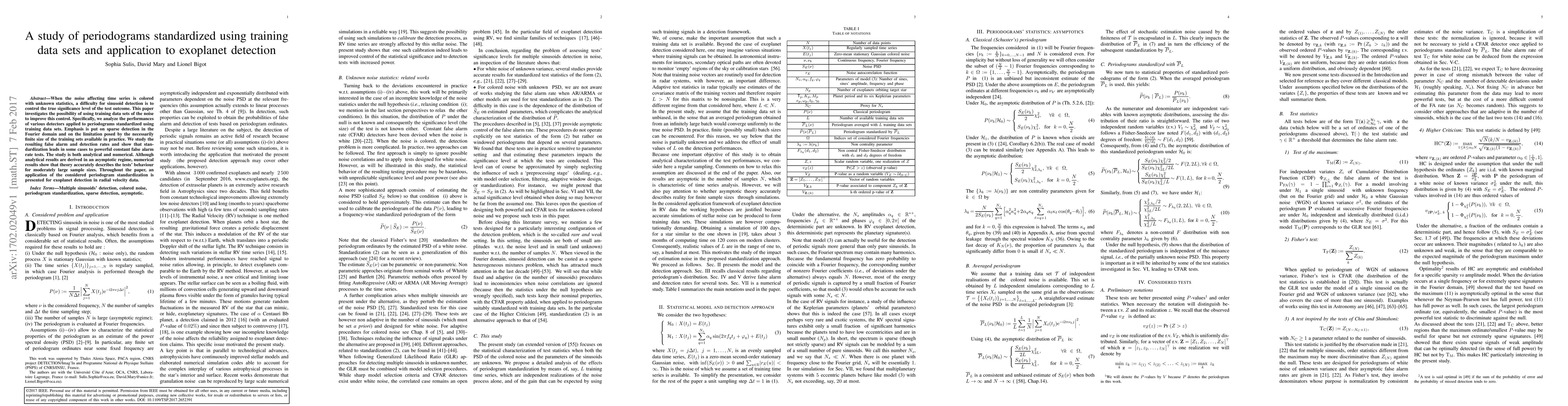 Researchers studied how to improve detection of periodic patterns in noisy data, particularly in exoplanet hunting, by using training sets to standardize noise levels. They found that this approach can lead to powerful tests with constant false alarm rates.