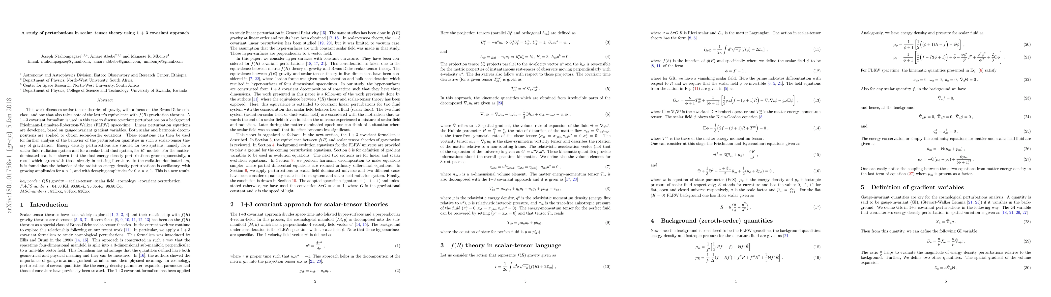 This paper explores scalar-tensor theories of gravity, specifically Brans-Dicke theory, using a 1+3 covariant approach to study perturbations in FLRW space-time. It develops linear perturbation equations and finds that dust energy density perturbations grow exponentially in the matter-dominated era, while radiation perturbations oscillate in the radiation-dominated era, with growing amplitudes for n>1 and decaying for 0<n<1.