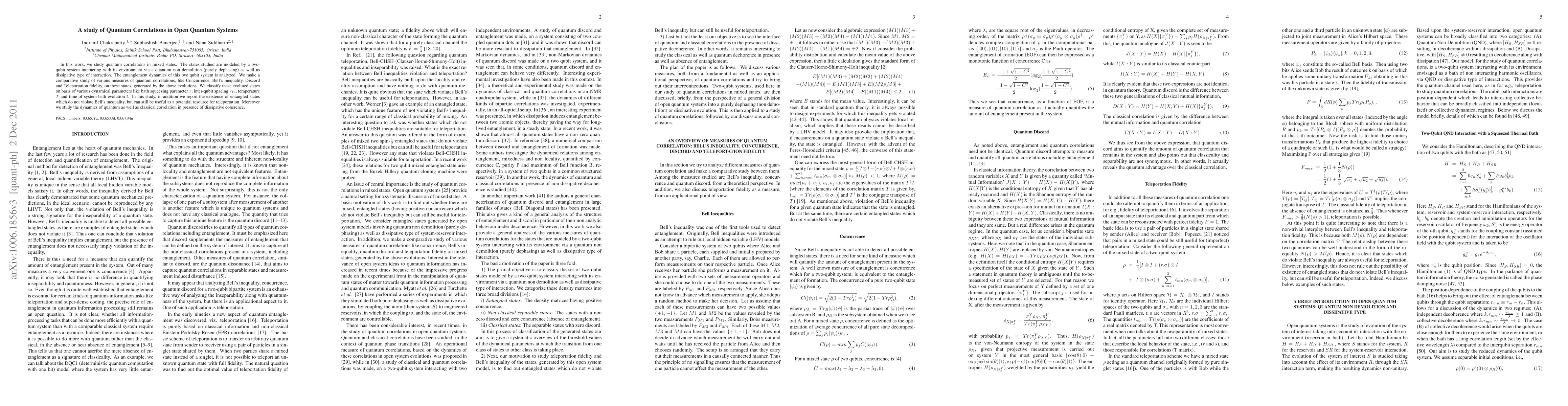 This paper investigates quantum correlations in mixed states of a two-qubit system interacting with its environment through dephasing and dissipative interactions. It compares various measures of quantum correlations and classifies evolved states based on parameters like bath squeezing, temperature, and time, highlighting the potential of non-Bell-violating entangled states for teleportation.