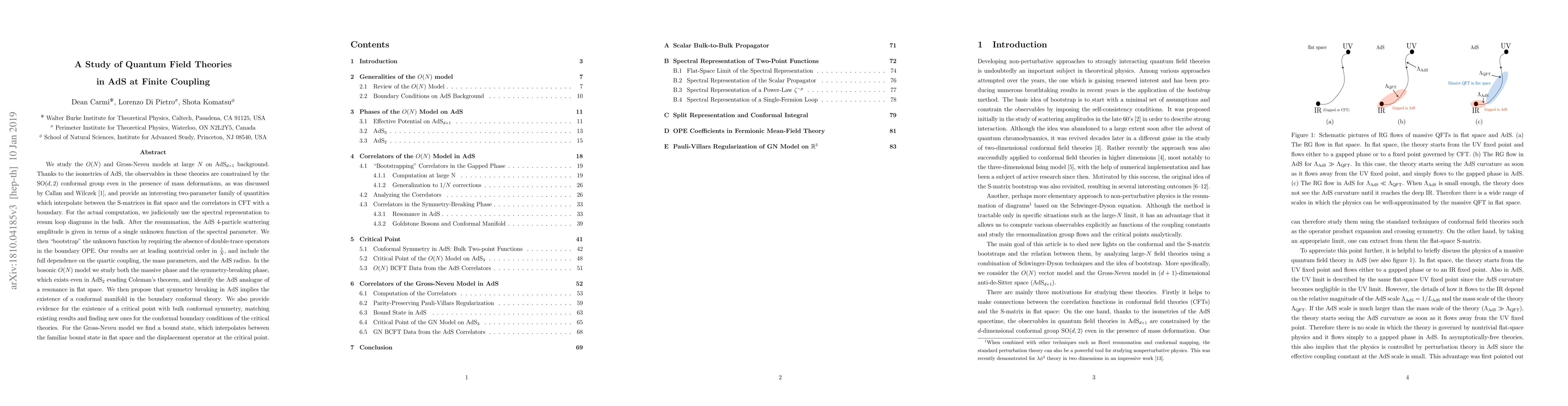 We study the $O(N)$ and Gross-Neveu models at large $N$ on AdS$_{d+1}$ background. Thanks to the isometries of AdS, the observables in these theories are constrained by the SO$(d,2)$ conformal group even in the presence of mass deformations, as was discussed by Callan and Wilczek, and provide an interesting two-parameter family of quantities which interpolate between the S-matrices in flat space and the correlators in CFT with a boundary. For the actual computation, we judiciously use the spectral representation to resum loop diagrams in the bulk. After the resummation, the AdS $4$-particle scattering amplitude is given in terms of a single unknown function of the spectral parameter. We then "bootstrap" the unknown function by requiring the absence of double-trace operators in the boundary OPE. Our results are at leading nontrivial order in $\frac{1}{N}$, and include the full dependence on the quartic coupling, the mass parameters, and the AdS radius. In the bosonic $O(N)$ model we study both the massive phase and the symmetry-breaking phase, which exists even in AdS$_2$ evading Coleman's theorem, and identify the AdS analogue of a resonance in flat space. We then propose that symmetry breaking in AdS implies the existence of a conformal manifold in the boundary conformal theory. We also provide evidence for the existence of a critical point with bulk conformal symmetry, matching existing results and finding new ones for the conformal boundary conditions of the critical theories. For the Gross-Neveu model we find a bound state, which interpolates between the familiar bound state in flat space and the displacement operator at the critical point.