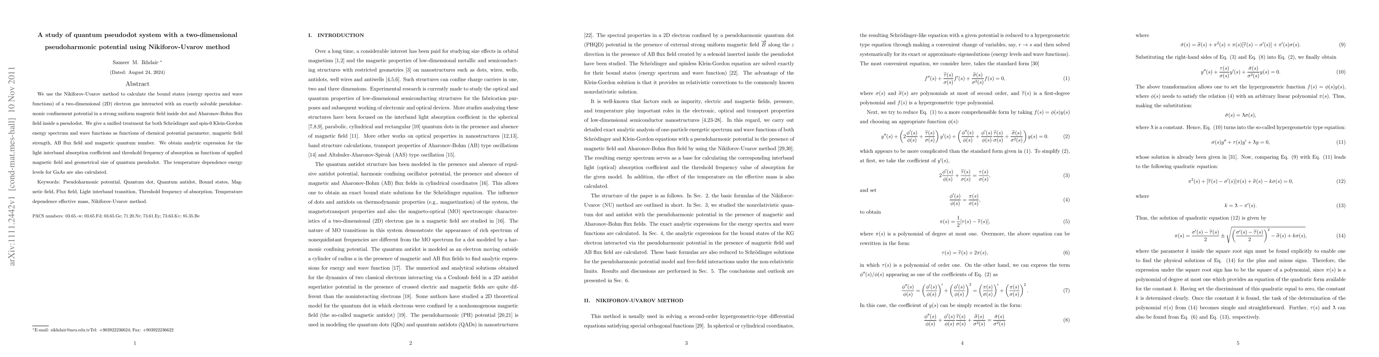 We use the Nikiforov-Uvarov method to calculate the bound states (energy spectra and wave functions) of a two-dimensional (2D) electron gas interacted with an exactly solvable pseudoharmonic confinement potential in a strong uniform magentic field inside dot and Aharonov-Bohm flux field inside a pseudodot. We give a unified treatment for both Schr\"odinger and spin-0 Klein-Gordon energy spectrum and wave functions as functions of chemical potential parameter, magnetic field strength, AB flux field and magnetic quantum number. We obtain analytic expression for the light interband absorption coefficient and threshold frequency of absorption as functions of applied magnetic field and geometrical size of quantum pseudodot. The temperature dependence energy levels for GaAs are also calculated.