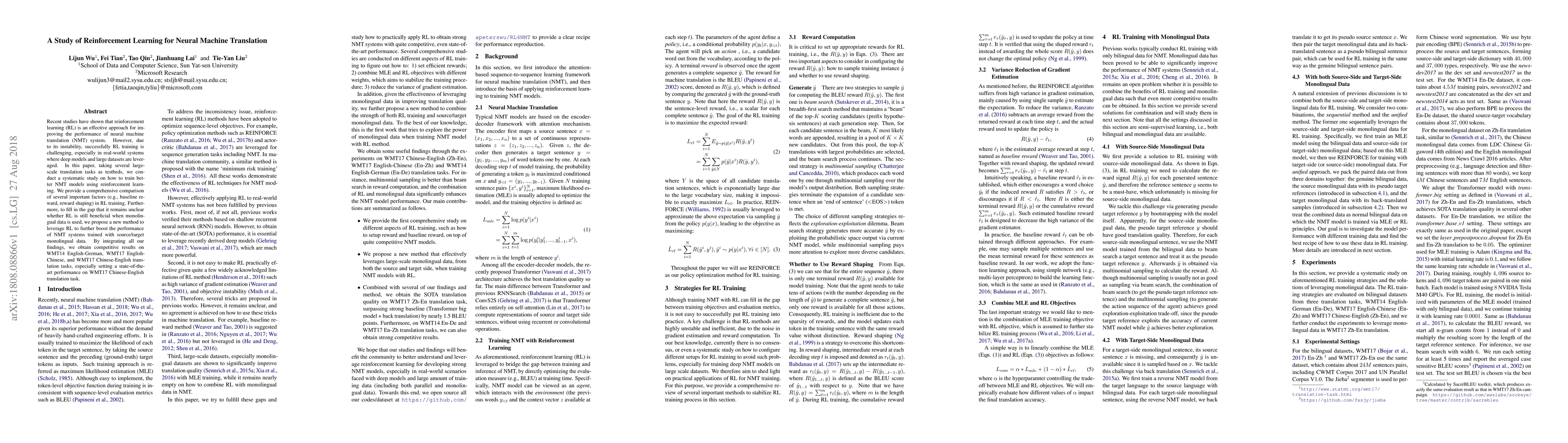 This paper investigates reinforcement learning (RL) for enhancing neural machine translation (NMT) performance, addressing its instability during training. The study proposes methods to leverage RL with monolingual data, achieving state-of-the-art results on several large-scale translation tasks.