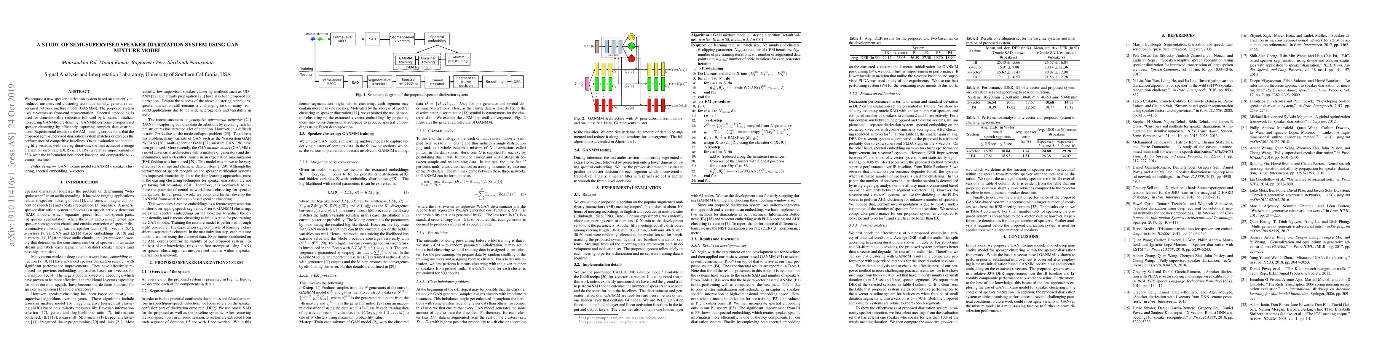 This paper proposes a semi-supervised speaker diarization system using a generative adversarial network mixture model (GANMM) with x-vectors for representation. The system achieves competitive performance, reducing the average diarization error rate by 33% compared to a baseline, demonstrating effective unsupervised clustering.