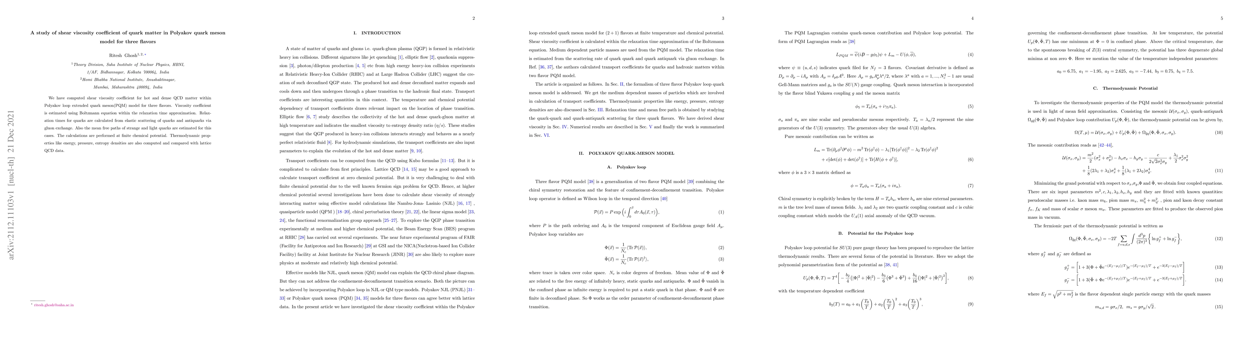This study computes the shear viscosity coefficient for hot and dense QCD matter using the Polyakov quark meson model for three flavors, employing the Boltzmann equation and relaxation time approximation. The research also estimates mean free paths and thermodynamic properties, comparing results with lattice QCD data.
