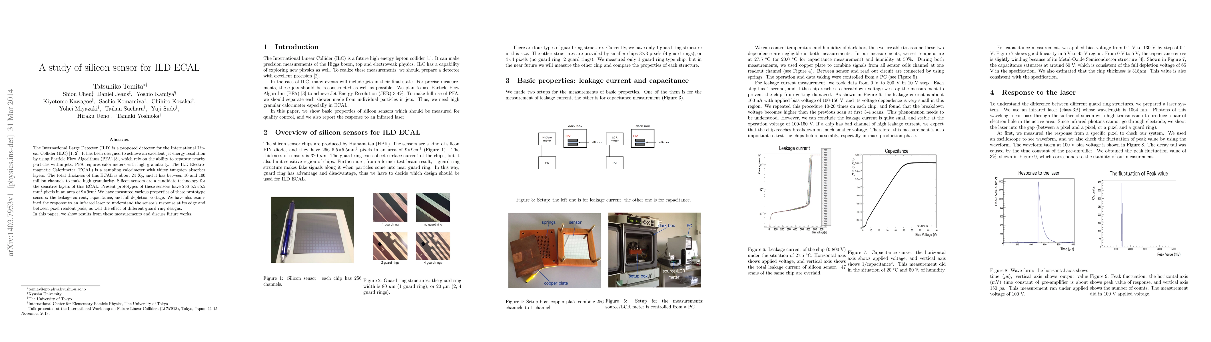This paper investigates silicon sensors for the ILD Electromagnetic Calorimeter (ECAL) in the proposed International Linear Collider (ILC) detector, focusing on leakage current, capacitance, and full depletion voltage. The study also examines the sensors' response to infrared laser and the impact of guard ring designs.