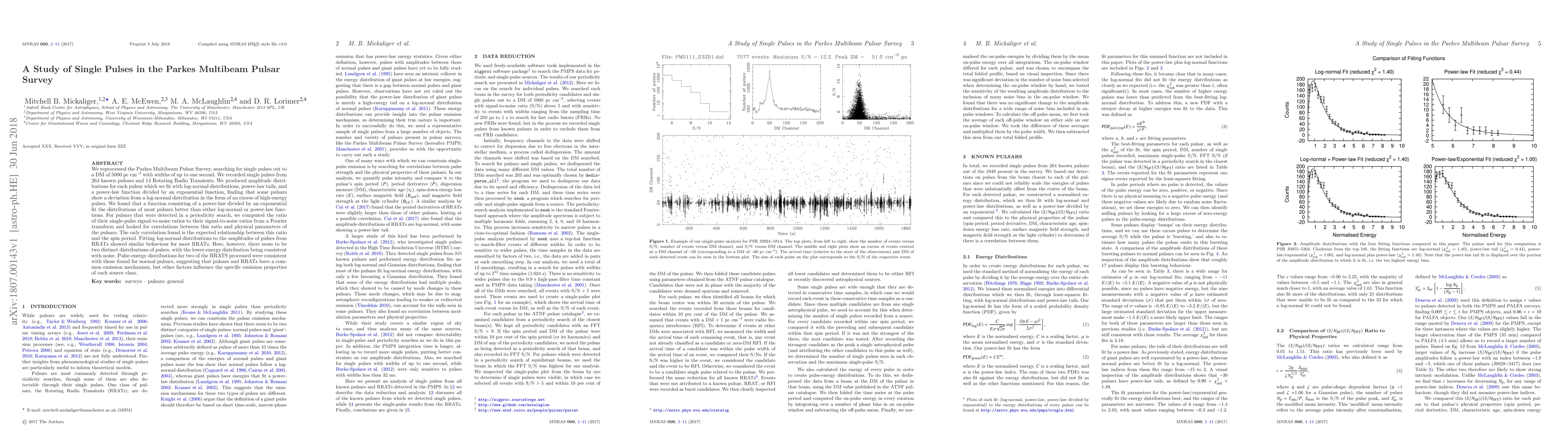 We reprocessed the Parkes Multibeam Pulsar Survey, searching for single pulses out to a DM of 5000 pc cm$^{-3}$ with widths of up to one second. We recorded single pulses from 264 known pulsars and 14 Rotating Radio Transients. We produced amplitude distributions for each pulsar which we fit with log-normal distributions, power-law tails, and a power-law function divided by an exponential function, finding that some pulsars show a deviation from a log-normal distribution in the form of an excess of high-energy pulses. We found that a function consisting of a power-law divided by an exponential fit the distributions of most pulsars better than either log-normal or power-law functions. For pulsars that were detected in a periodicity search, we computed the ratio of their single-pulse signal-to-noise ratios to their signal-to-noise ratios from a Fourier transform and looked for correlations between this ratio and physical parameters of the pulsars. The only correlation found is the expected relationship between this ratio and the spin period. Fitting log-normal distributions to the amplitudes of pulses from RRATs showed similar behaviour for most RRATs. Here, however, there seem to be two distinct distributions of pulses, with the lower-energy distribution being consistent with noise. Pulse-energy distributions for two of the RRATS processed were consistent with those found for normal pulsars, suggesting that pulsars and RRATs have a common emission mechanism, but other factors influence the specific emission properties of each source class.