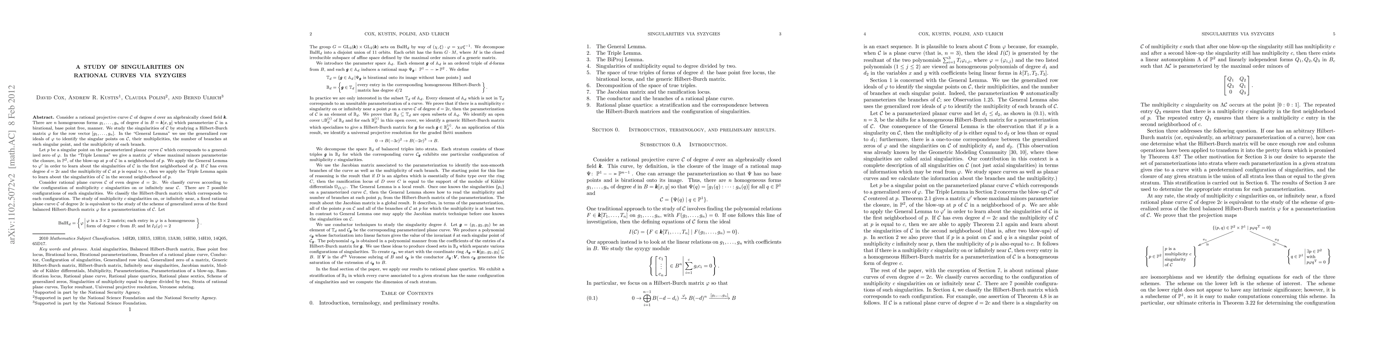 Consider a rational projective curve C of degree d over an algebraically closed field k. There are n homogeneous forms g_1,...,g_n of degree d in B=k[x,y] which parameterize C in a birational, base point free, manner. We study the singularities of C by studying a Hilbert-Burch matrix phi for the row vector [g_1,...,g_n]. In the "General Lemma" we use the generalized row ideals of phi to identify the singular points on C, their multiplicities, the number of branches at each singular point, and the multiplicity of each branch. Let p be a singular point on the parameterized planar curve C which corresponds to a generalized zero of phi. In the "Triple Lemma" we give a matrix phi' whose maximal minors parameterize the closure, in projective 2-space, of the blow-up at p of C in a neighborhood of p. We apply the General Lemma to phi' in order to learn about the singularities of C in the first neighborhood of p. If C has even degree d=2c and the multiplicity of C at p is equal to c, then we apply the Triple Lemma again to learn about the singularities of C in the second neighborhood of p. Consider rational plane curves C of even degree d=2c. We classify curves according to the configuration of multiplicity c singularities on or infinitely near C. There are 7 possible configurations of such singularities. We classify the Hilbert-Burch matrix which corresponds to each configuration. The study of multiplicity c singularities on, or infinitely near, a fixed rational plane curve C of degree 2c is equivalent to the study of the scheme of generalized zeros of the fixed balanced Hilbert-Burch matrix phi for a parameterization of C.
