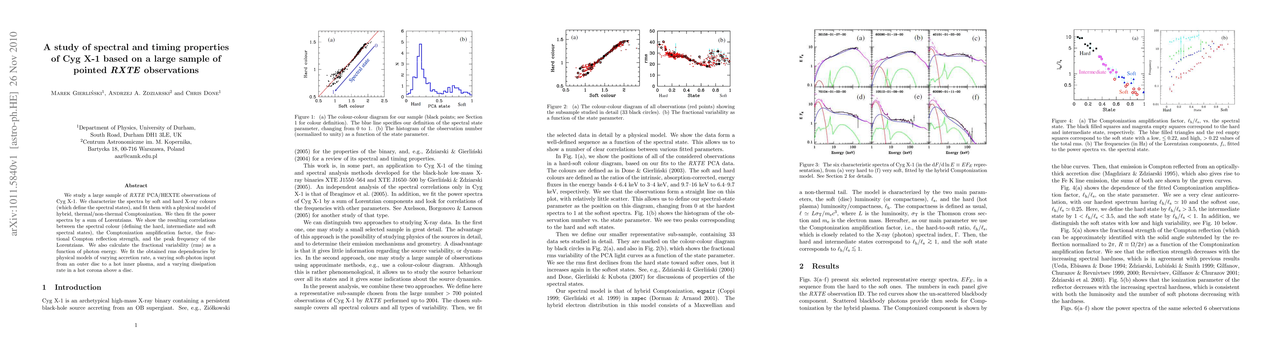 We study a large sample of RXTE PCA/HEXTE observations of Cyg X-1. We characterize the spectra by soft and hard X-ray colours (which define the spectral states), and fit them with a physical model of hybrid, thermal/non-thermal Comptonization. We then fit the power spectra by a sum of Lorentzians. We show the resulting correlations between the spectral colour (defining the hard, intermediate and soft spectral states), the Comptonization amplification factor, the fractional Compton reflection strength, and the peak frequency of the Lorentzians. We also calculate the fractional variability (rms) as a function of photon energy. We fit the obtained rms dependencies by physical models of varying accretion rate, a varying soft-photon input from an outer disc to a hot inner plasma, and a varying dissipation rate in a hot corona above a disc.