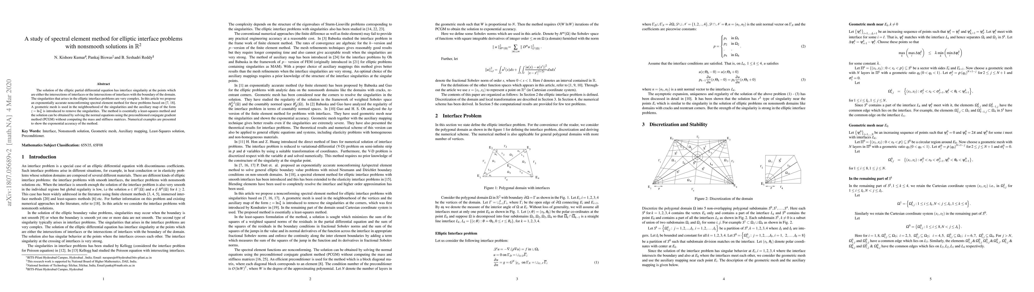 The solution of the elliptic partial differential equation has interface singularity at the points which are either the intersections of interfaces or the intersections of interfaces with the boundary of the domain. The singularities that arises in the elliptic interface problems are very complex. In this article, we propose an exponentially accurate nonconforming spectral element method for these problems based on [7, 18]. A geometric mesh is used in the neighbourhood of the singularities and the auxiliary map of the form $z=ln\xi$ is introduced to remove the singularities. The method is essentially a least-squares method and the solution can be obtained by solving the normal equations using the preconditioned conjugate gradient method (PCGM) without computing the mass and stiffness matrices. Numerical examples are presented to show the exponential accuracy of the method.