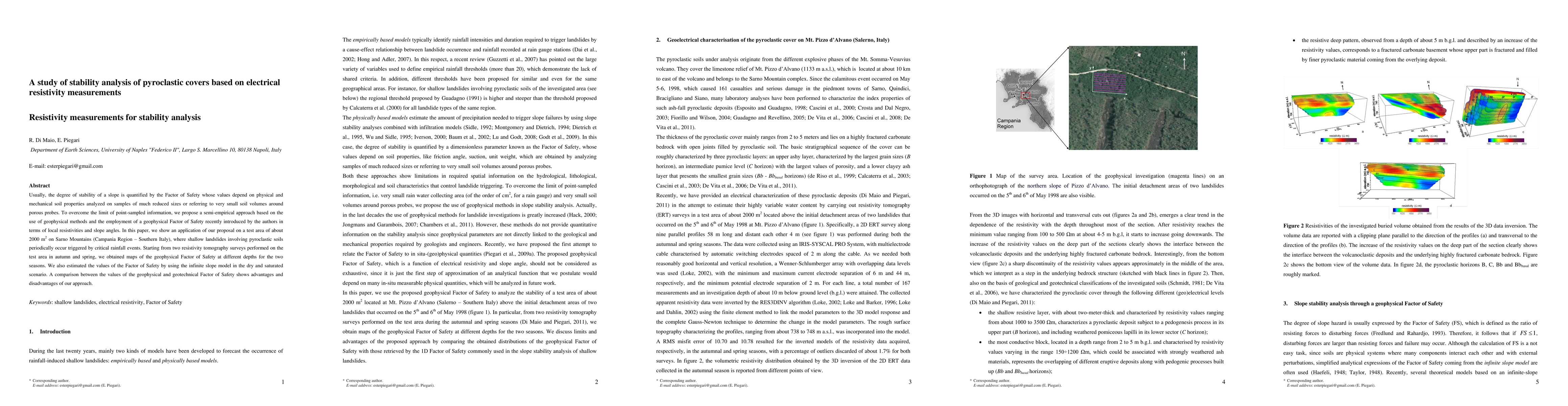 This study proposes a semi-empirical method using electrical resistivity measurements to assess the stability of pyroclastic covers in Sarno Mountains, Italy, by comparing geophysical and geotechnical Factors of Safety derived from resistivity tomography and infinite slope models. The results highlight the benefits and limitations of geophysical approaches over traditional geotechnical methods.
