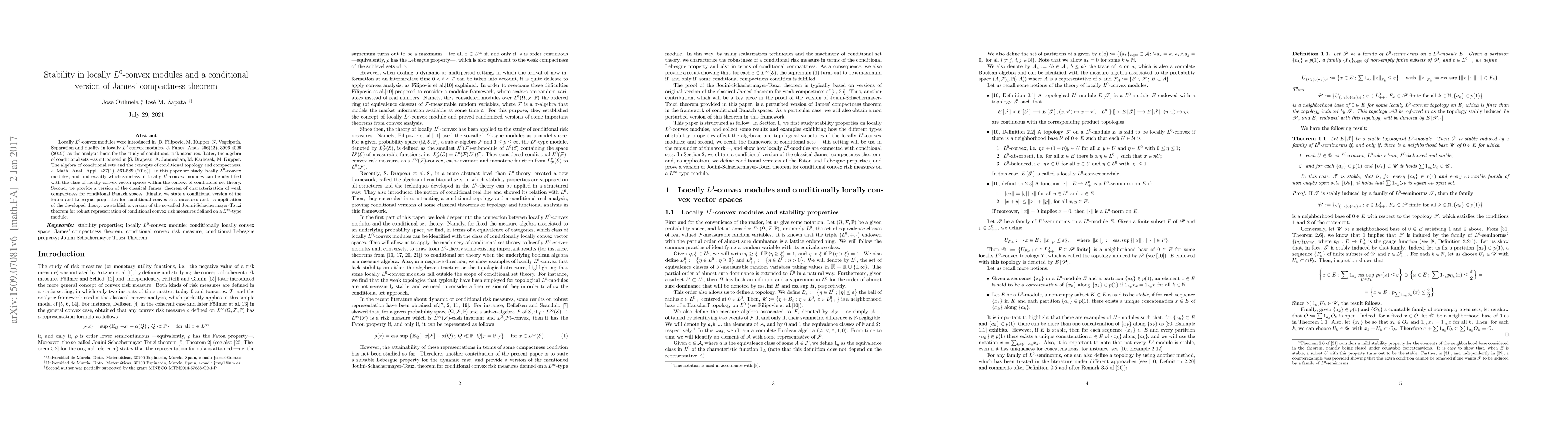 This paper studies stability in locally $L^0$-convex modules, characterizing which ones can be identified with locally convex vector spaces, and providing conditional versions of James' theorem and the Jouini-Schachermayer-Touzi theorem for robust representation of risk measures.