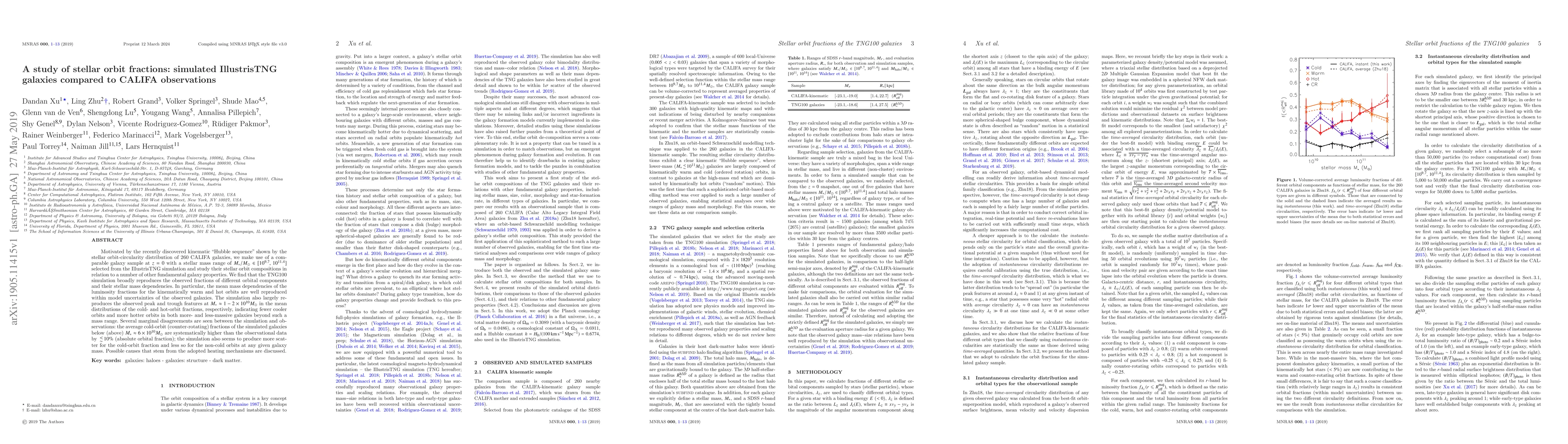 Motivated by the recently discovered kinematic "Hubble sequence" shown by the stellar orbit-circularity distribution of 260 CALIFA galaxies, we make use of a comparable galaxy sample at z = 0 with a stellar mass range from 5E9 to 5E11 solar masses, selected from the IllustrisTNG simulation and study their stellar orbit compositions in relation to a number of other fundamental galaxy properties.We find that the TNG100 simulation broadly reproduces the observed fractions of different orbital components and their stellar mass dependencies. In particular, the mean mass dependencies of the luminosity fractions for the kinematically warm and hot orbits are well reproduced within model uncertainties of the observed galaxies. The simulation also largely reproduces the observed peak and trough features at a stellar mass of 1-2E10 solar masses, in the mean distributions of the cold- and hot-orbit fractions, respectively, indicating fewer cooler orbits and more hotter orbits in both more- and less-massive galaxies beyond such a mass range. Several marginal disagreements are seen between the simulation and observations: the average cold-orbit (counter-rotating) fractions of the simulated galaxies below (above) a stellar mass of 6E10 solar masses, are systematically higher than the observational data by < 10% (absolute orbital fraction); the simulation also seems to produce more scatter for the cold-orbit fraction and less so for the non-cold orbits at any given galaxy mass. Possible causes that stem from the adopted heating mechanisms are discussed.
