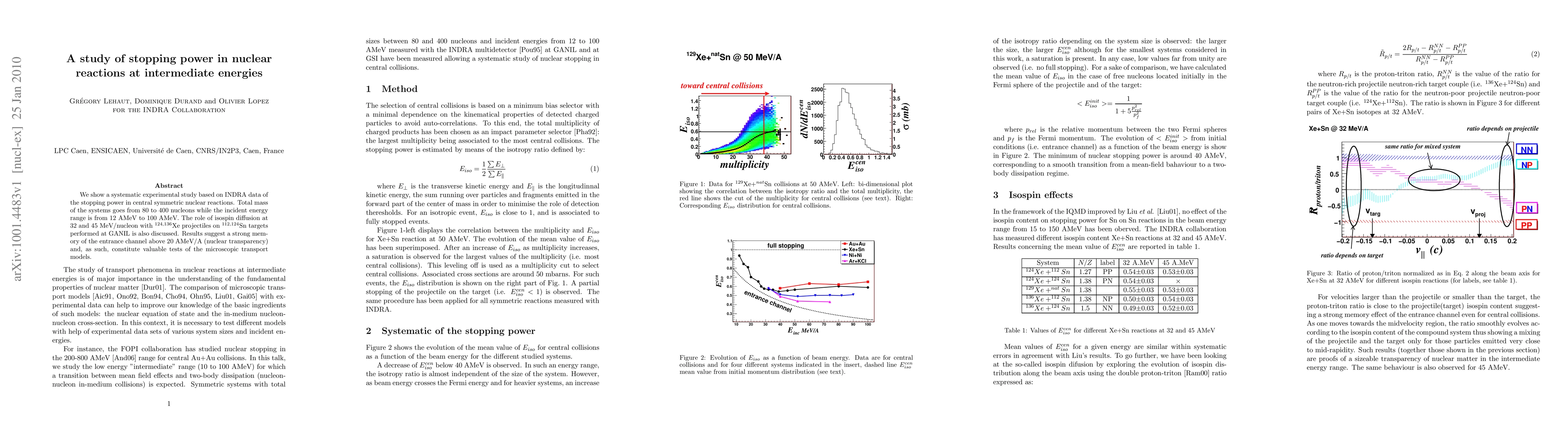 We show a systematic experimental study based on INDRA data of the stopping power in central symmetric nuclear reactions. Total mass of the systems goes from 80 to 400 nucleons while the incident energy range is from 12 AMeV to 100 AMeV. The role of isospin diffusion at 32 and 45 MeV/nucleon with 124,136Xe projectiles on 112,124Sn targets performed at GANIL is also discussed. Results suggest a strong memory of the entrance channel above 20 AMeV/A (nuclear transparency) and, as such, constitute valuable tests of the microscopic transport models.