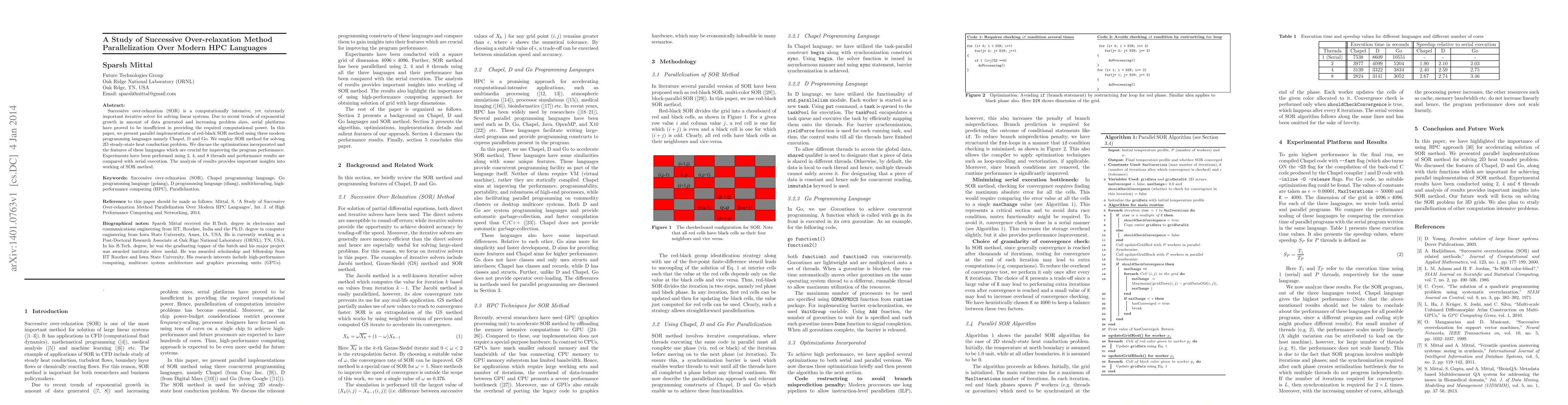 Successive over-relaxation (SOR) is a computationally intensive, yet extremely important iterative solver for solving linear systems. Due to recent trends of exponential growth in amount of data generated and increasing problem sizes, serial platforms have proved to be insufficient in providing the required computational power. In this paper, we present parallel implementations of red-black SOR method using three modern programming languages namely Chapel, D and Go. We employ SOR method for solving 2D steady-state heat conduction problem. We discuss the optimizations incorporated and the features of these languages which are crucial for improving the program performance. Experiments have been performed using 2, 4, and 8 threads and performance results are compared with serial execution. The analysis of results provides important insights into working of SOR method.