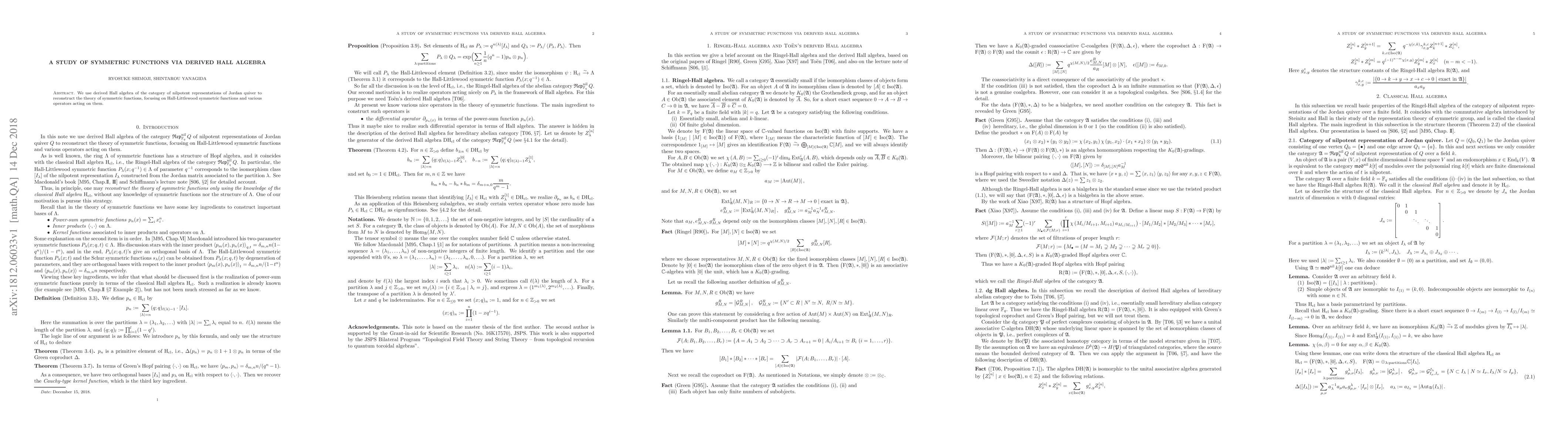 This paper reconstructs the theory of symmetric functions, particularly Hall-Littlewood symmetric functions, using the derived Hall algebra of nilpotent representations of the Jordan quiver, and explores various operators acting on these functions.