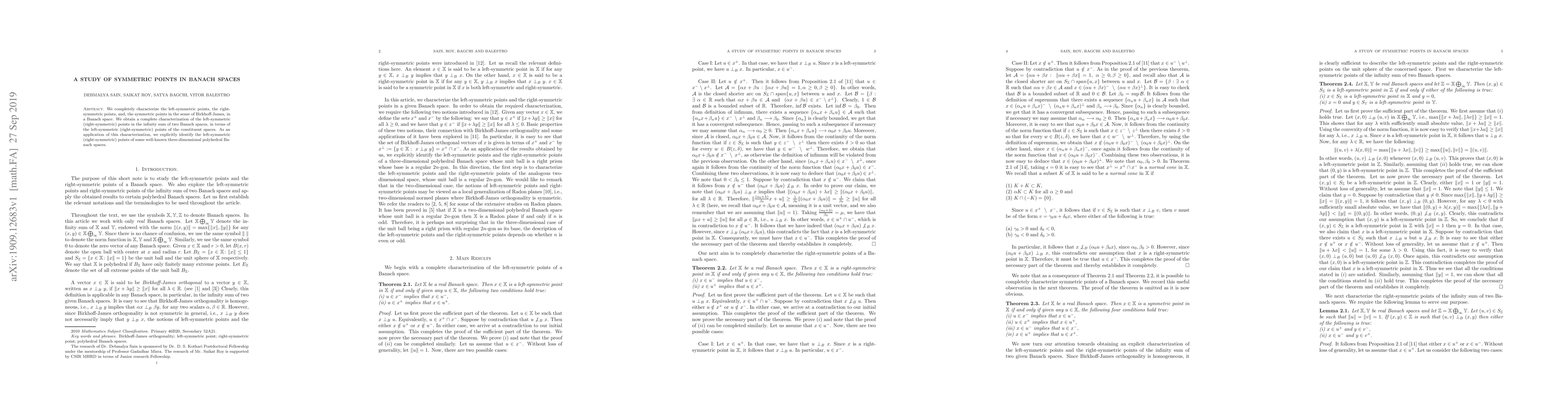 The research completely characterizes left-symmetric points, right-symmetric points, and symmetric points (in the sense of Birkhoff-James) in Banach spaces. It also provides characterizations for the infinity sum of two Banach spaces and applies these findings to identify symmetric points in well-known three-dimensional polyhedral Banach spaces.