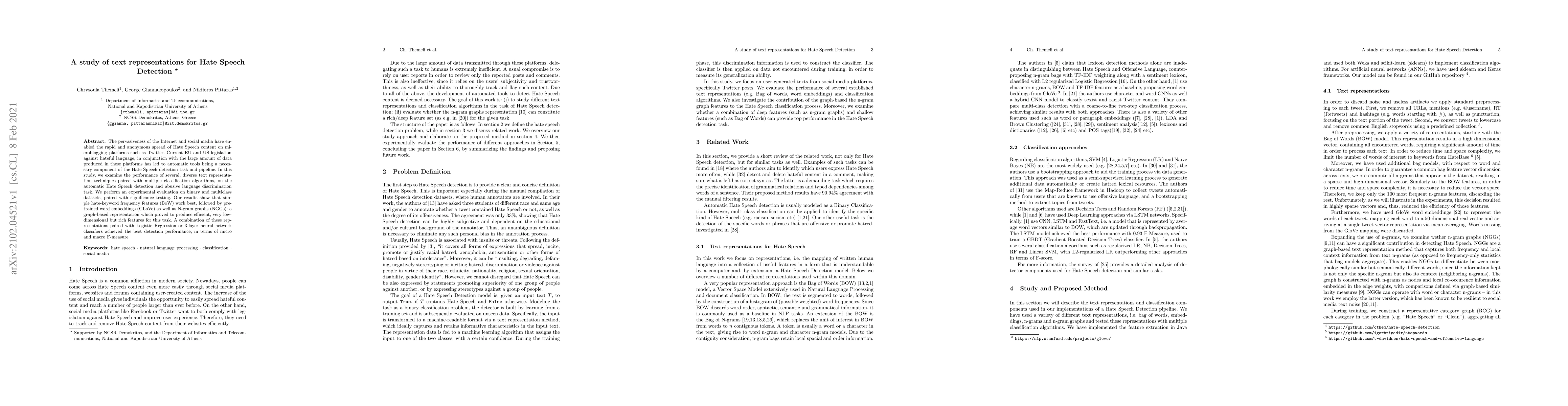 This study evaluates various text representation techniques for detecting Hate Speech on social media, finding that simple keyword frequency features (BoW) and pre-trained embeddings (GLoVe) perform best, with a combination of these methods and Logistic Regression or neural networks yielding the highest detection accuracy.