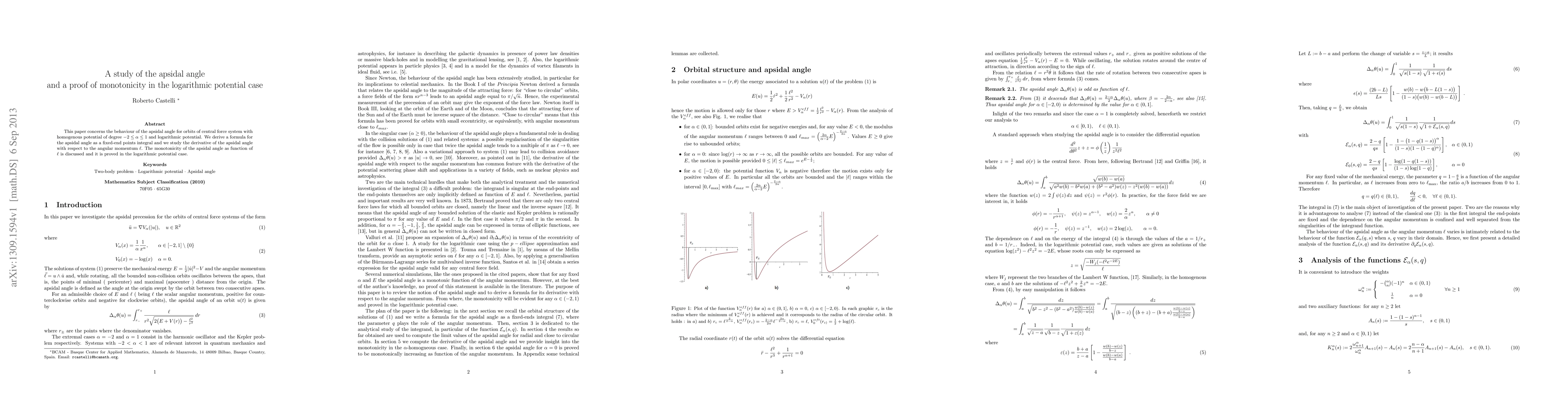 This paper concerns the behaviour of the apsidal angle for orbits of central force system with homogenous potential of degree $-2\leq \alpha\leq 1$ and logarithmic potential. We derive a formula for the apsidal angle as a fixed-end points integral and we study the derivative of the apsidal angle with respect to the angular momentum $\ell$. The monotonicity of the apsidal angle as function of $\ell$ is discussed and it is proved in the logarithmic potential case.