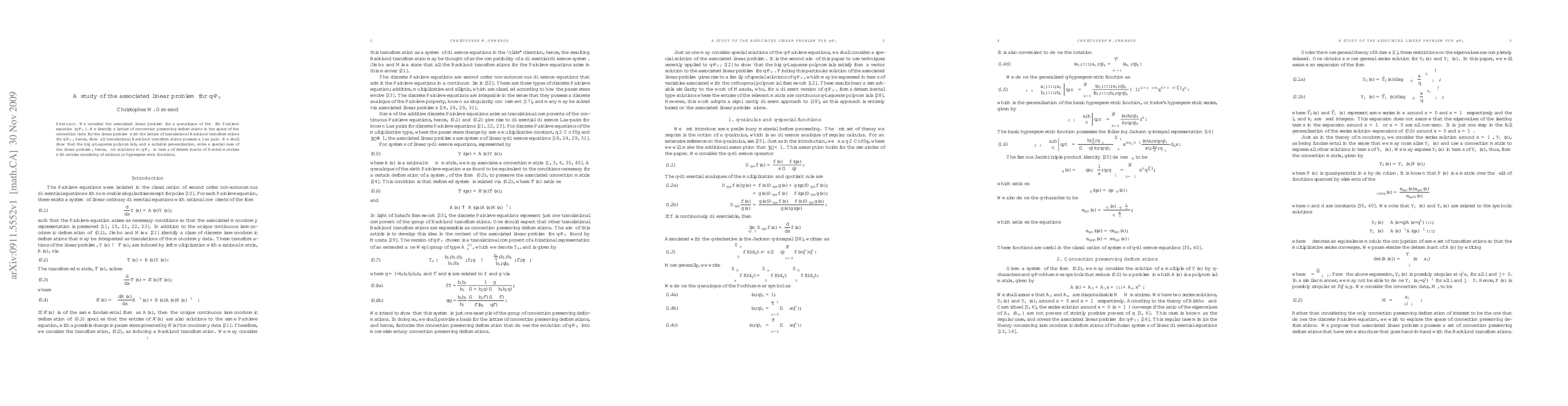 We consider the associated linear problem for a q-analogue of the fifth Painleve equation (qPV). We identify a lattice of connection preserving deformations in the space of the connection data for the linear problem with the lattice of translational Backlund transformations for qPV, hence, show all translational Backlund transformations possess a Lax pair. We shall show that the big q-Laguerre polynomials, and a suitable generalization, solve a special case of the linear problem, hence, find solutions to qPV in terms of determinants of Hankel matrices with entries consisting of rational or hypergeometric functions.