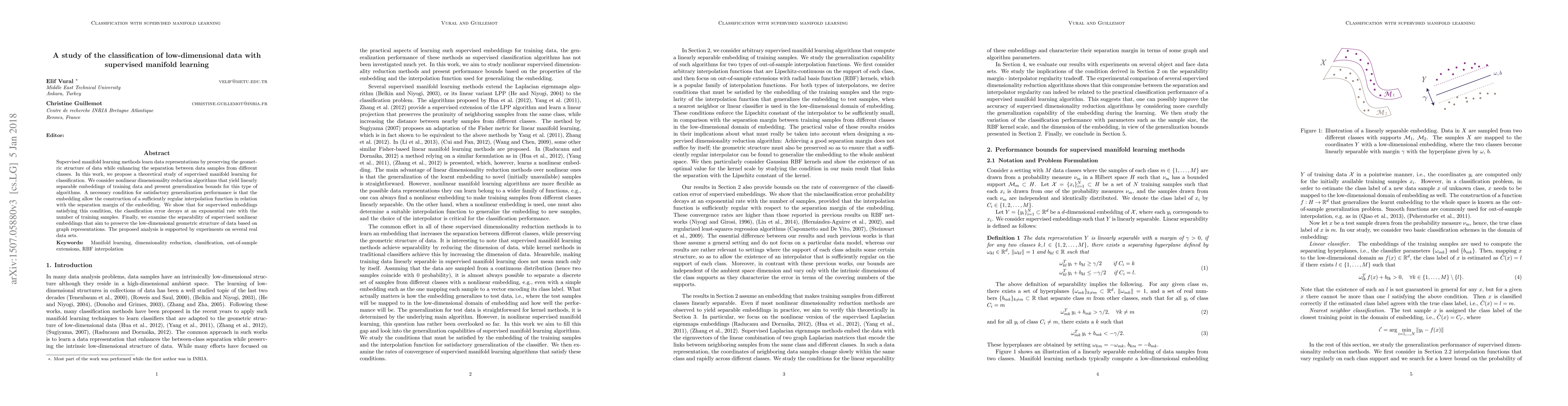 This study investigates supervised manifold learning for classification, focusing on nonlinear dimensionality reduction that produces linearly separable embeddings. It provides theoretical generalization bounds and demonstrates that embeddings allowing for sufficiently regular interpolation functions lead to exponential decay in classification error with more training samples. Experiments on real datasets validate the proposed analysis.