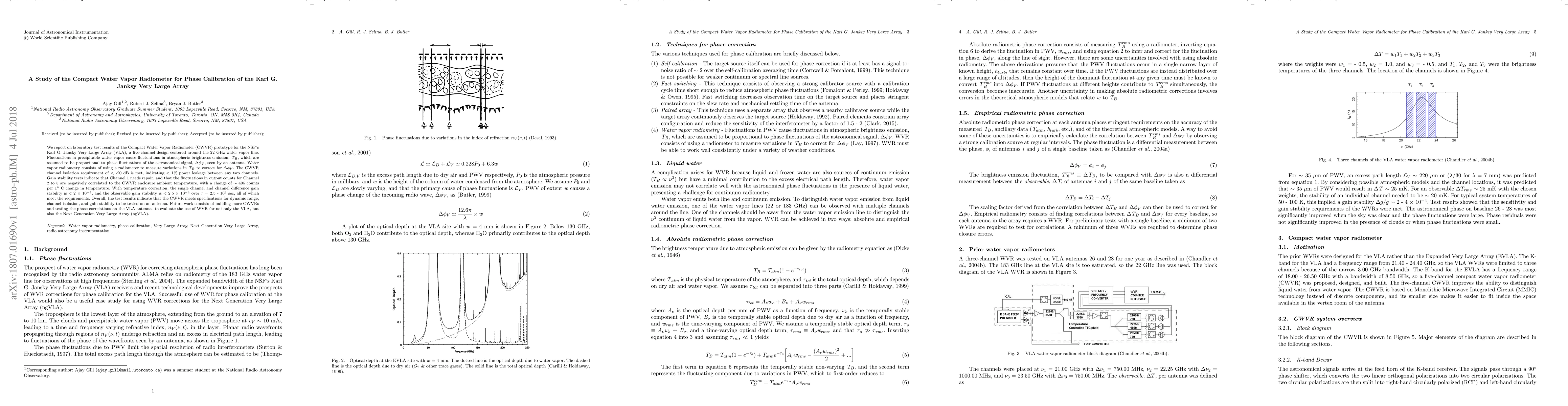 We report on laboratory test results of the Compact Water Vapor Radiometer (CWVR) prototype for the NSF's Karl G. Jansky Very Large Array (VLA), a five-channel design centered around the 22 GHz water vapor line. Fluctuations in precipitable water vapor cause fluctuations in atmospheric brightness emission, which are assumed to be proportional to phase fluctuations of the astronomical signal seen by an antenna. Water vapor radiometry consists of using a radiometer to measure variations in the atmospheric brightness emission to correct for the phase fluctuations. The CWVR channel isolation requirement of < -20 dB is met, indicating < 1% power leakage between any two channels. Gain stability tests indicate that Channel 1 needs repair, and that the fluctuations in output counts for Channel 2 to 5 are negatively correlated to the CWVR enclosure ambient temperature, with a change of ~ 405 counts per 1 degree C change in temperature. With temperature correction, the single channel and channel difference gain stability is < 2 x 10^-4, and the observable gain stability is < 2.5 x 10^-4 over t = 2.5 - 10^3 sec, all of which meet the requirements. Overall, the test results indicate that the CWVR meets specifications for dynamic range, channel isolation, and gain stability to be tested on an antenna. Future work consists of building more CWVRs and testing the phase correlations on the VLA antennas to evaluate the use of WVR for not only the VLA, but also the Next Generation Very Large Array (ngVLA).