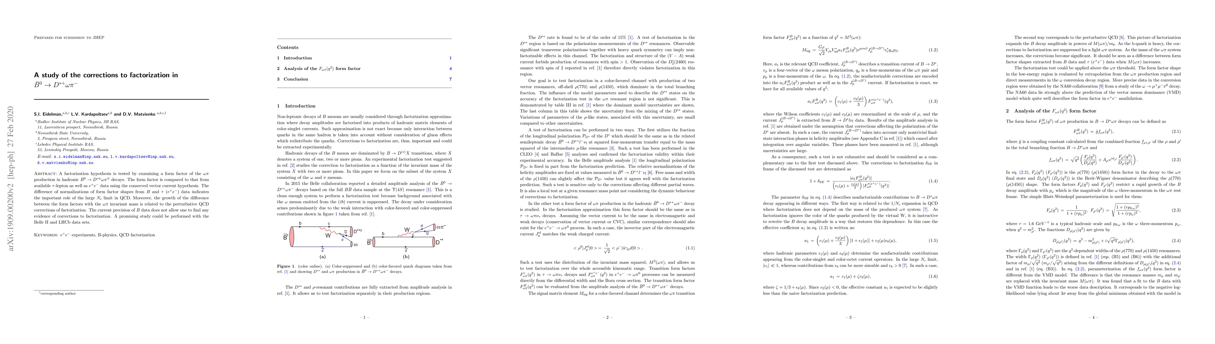 A factorization hypothesis is tested by examining a form factor of the $\omega\pi$ production in hadronic $B^0 \to D^{\ast \pm}\omega\pi^\mp$ decays. The form factor is compared to that from available $\tau$-lepton as well as $e^+e^-$ data using the conserved vector current hypothesis. The difference of normalizations of form factor shapes from $B$ and $\tau~(e^+e^-)$ data indicates the important role of the large $N_c$ limit in QCD. Moreover, the growth of the difference between the form factors with the $\omega\pi$ invariant mass is related to the perturbative QCD corrections of factorization. The current precision of $B$ data does not allow one to find any evidence of corrections to factorization. A promising study could be performed with the Belle II and LHCb data sets.
