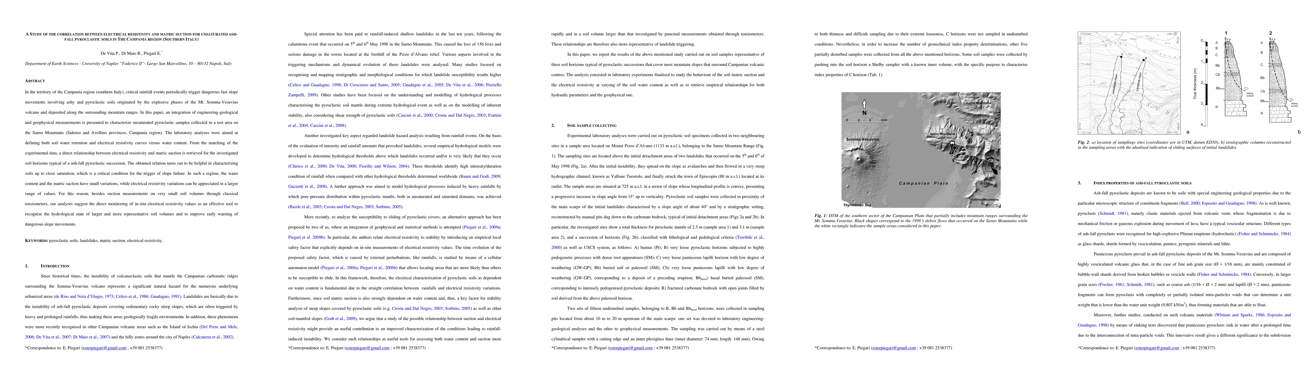 In the territory of the Campania region (southern Italy), critical rainfall events periodically trigger dangerous fast slope movements involving ashy and pyroclastic soils originated by the explosive phases of the Mt. Somma-Vesuvius volcano and deposited along the surrounding mountain ranges. In this paper, an integration of engineering-geological and geophysical measurements is presented to characterize unsaturated pyroclastic samples collected in a test area on the Sarno Mountains (Salerno and Avellino provinces, Campania region). The laboratory analyses were aimed at defining both soil water retention and electrical resistivity curves versus water content. From the matching of the experimental data, a direct relationship between electrical resistivity and matric suction is retrieved for the investigated soil horizons typical of a ash-fall pyroclastic succession. The obtained relation turns out to be helpful in characterizing soils up to close saturation, which is a critical condition for the trigger of slope failure. In such a regime, the water content and the matric suction have small variations, while electrical resistivity variations can be appreciated in a larger range of values. For this reason, besides suction measurements on very small soil volumes through classical tensiometers, our analyses suggest the direct monitoring of in-situ electrical resistivity values as an effective tool to recognise the hydrological state of larger and more representative soil volumes and to improve early warning of dangerous slope movements.