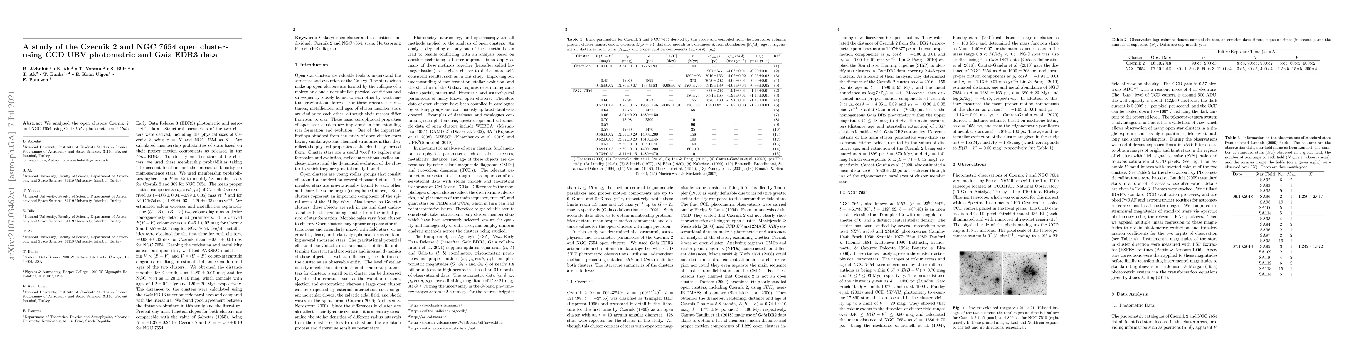 This study analyzed the open clusters Czernik 2 and NGC 7654 using CCD UBV and Gaia EDR3 data, deriving structural parameters, member star probabilities, and estimating distance moduli, ages, and metallicities for both clusters. The findings show good agreement with existing literature.