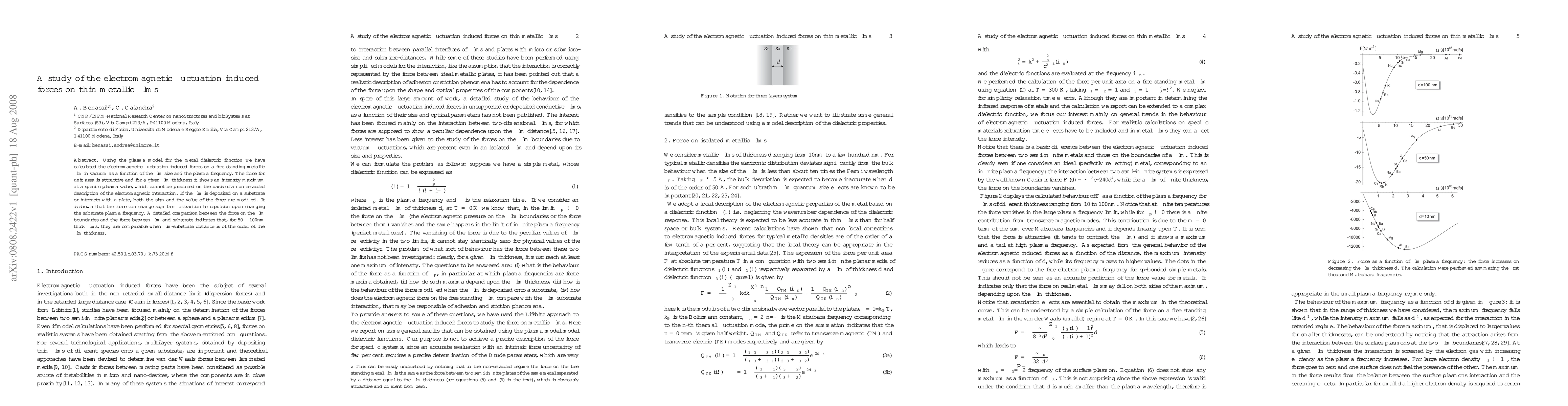 This study calculates electromagnetic fluctuation induced forces on thin metallic films in vacuum, revealing an attractive force dependent on film size and plasma frequency, with a maximum intensity at a specific plasma value. The force can change from attraction to repulsion when the film is on a substrate, depending on the substrate's plasma frequency.