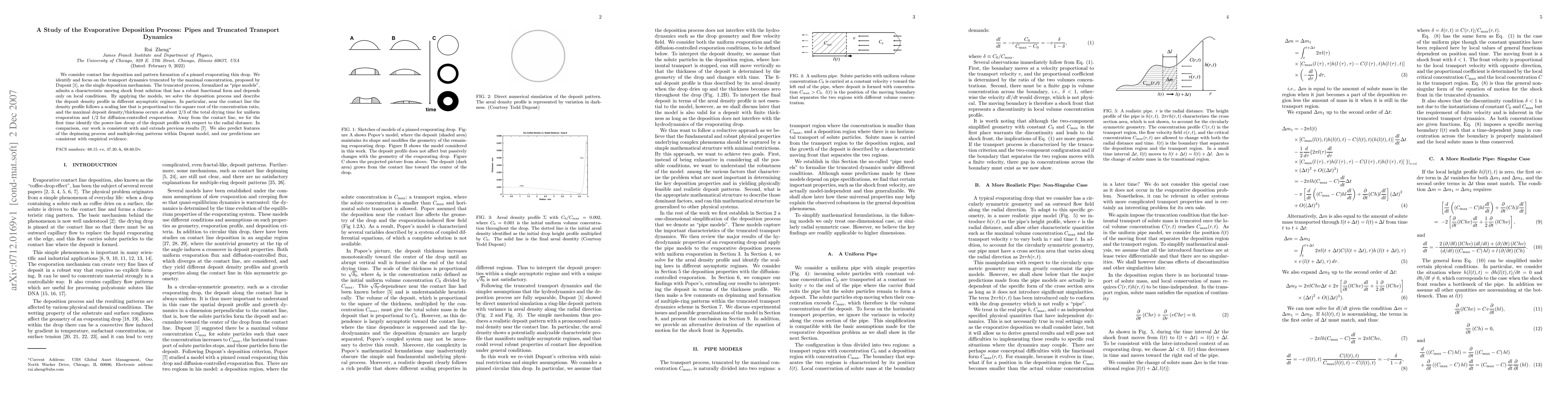 This paper studies the evaporative deposition process in pinned evaporating thin drops, focusing on the truncated transport dynamics. It identifies a characteristic moving shock front solution in "pipe models" that predicts deposit density profiles, revealing a scaling law near the contact line and a power-law decay away from it, consistent with empirical observations.