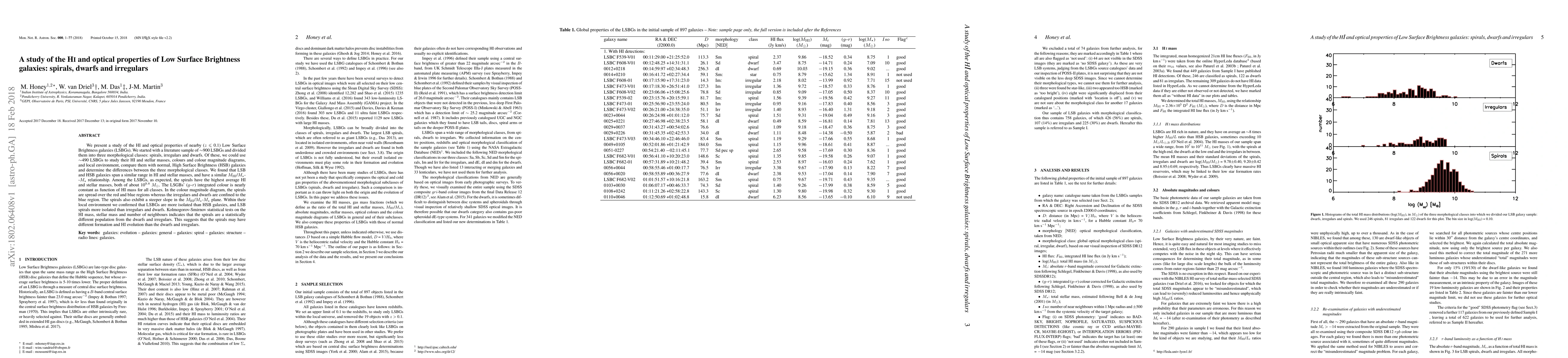 We present a study of the HI and optical properties of nearby ($z$ $\le$ 0.1) Low Surface Brightness galaxies (LSBGs). We started with a literature sample of $\sim$900 LSBGs and divided them into three morphological classes: spirals, irregulars and dwarfs. Of these, we could use $\sim$490 LSBGs to study their HI and stellar masses, colours and colour magnitude diagrams, and local environment, compare them with normal, High Surface Brightness (HSB) galaxies and determine the differences between the three morphological classes. We found that LSB and HSB galaxies span a similar range in HI and stellar masses, and have a similar $M_{\rm HI}$/$M_{\star}$--$M_{\star}$ relationship. Among the LSBGs, as expected, the spirals have the highest average HI and stellar masses, both of about 10$^{9.8}$ $M_\odot$. The LSGBs' ($g$--$r$) integrated colour is nearly constant as function of HI mass for all classes. In the colour magnitude diagram, the spirals are spread over the red and blue regions whereas the irregulars and dwarfs are confined to the blue region. The spirals also exhibit a steeper slope in the $M_{\rm HI}$/$M_{\star}$--$M_{\star}$ plane. Within their local environment we confirmed that LSBGs are more isolated than HSB galaxies, and LSB spirals more isolated than irregulars and dwarfs. Kolmogorov-Smirnov statistical tests on the HI mass, stellar mass and number of neighbours indicates that the spirals are a statistically different population from the dwarfs and irregulars. This suggests that the spirals may have different formation and HI evolution than the dwarfs and irregulars.
