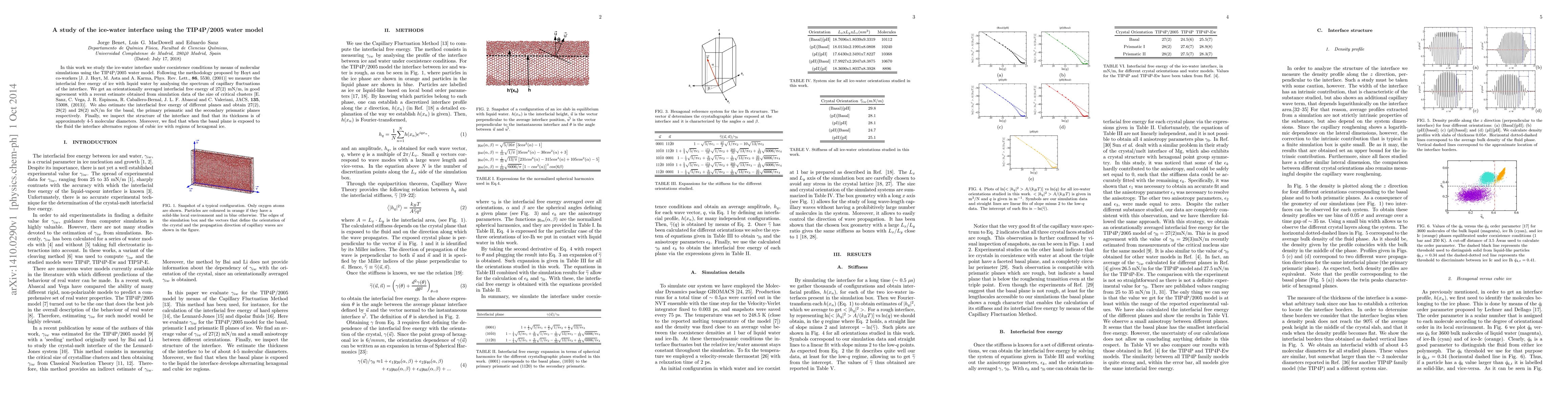 Researchers used molecular simulations to study the ice-water interface, finding an interfacial free energy of 27mN/m, with variations depending on the plane exposed to water; they also found a thickness of approximately 4-5 molecular diameters.