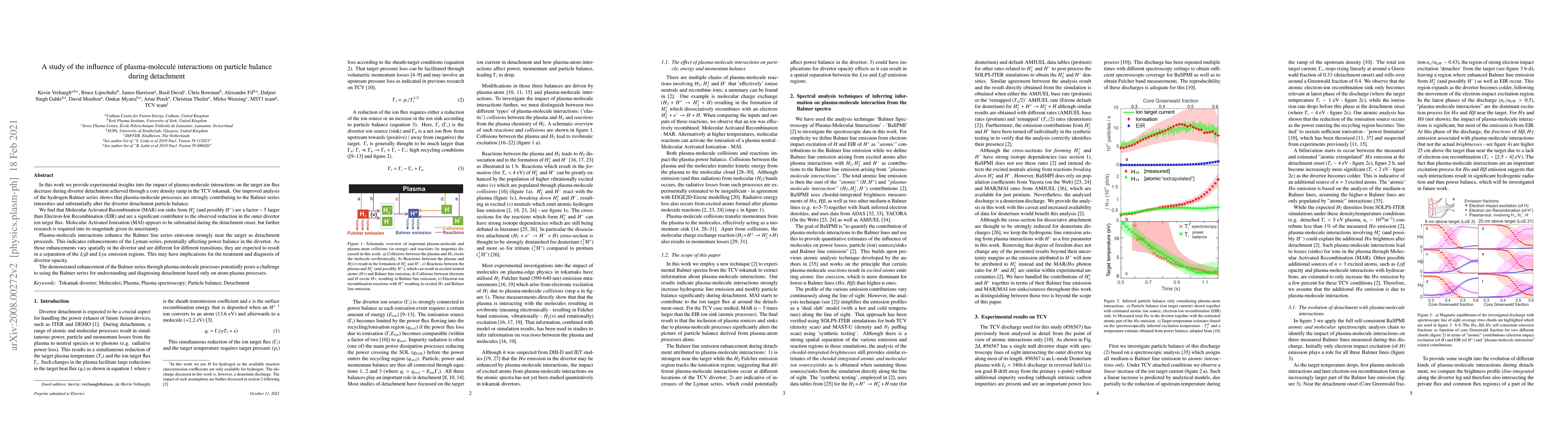 In this work we provide experimental insights into the impact of plasma-molecule interactions on the target ion flux decrease during divertor detachment achieved through a core density ramp in the TCV tokamak. Our improved analysis of the hydrogen Balmer series shows that plasma-molecule processes are strongly contributing to the Balmer series intensities and substantially alter the divertor detachment particle balance. We find that Molecular Activated Recombination (MAR) ion sinks from $H_2^+$ and/or $H^-$ are a factor $\sim$ 5 larger than Electron-Ion Recombination (EIR) and are a significant contributor to the observed reduction in the outer divertor ion target flux. Molecular Activated Ionisation (MAI) may also be significant during detachment. Plasma-molecule interactions enhance the Balmer line series emission strongly near the target as detachment proceeds. This indicates enhancements of the Lyman series, potentially affecting power balance in the divertor. As those enhancements vary spatially in the divertor and are different for different transitions, they are expected to result in a separation of the $Ly\beta$ and $Ly\alpha$ emission regions. This may have implications for the treatment and diagnosis of divertor opacity. The demonstrated enhancement of the Balmer series through plasma-molecule processes potentially poses a challenge to using the Balmer series for understanding and diagnosing detachment based only on atom-plasma processes.