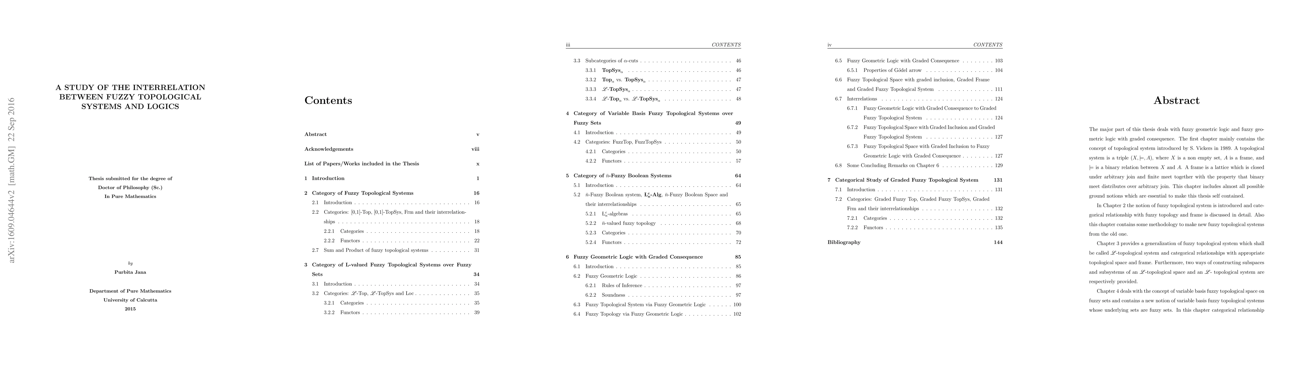 The major part of this thesis deals with fuzzy geometric logic and fuzzy geometric logic with graded consequence. The first chapter mainly contains the concept of topological system introduced by S. Vickers in 1989. In Chapter 2 the notion of fuzzy topological system is introduced and categorical relationship with fuzzy topology and frame is discussed in detail. Also this chapter contains some methodology to make new fuzzy topological systems from the old one.Chapter 3 provides a generalization of fuzzy topological system which shall be called L topological system and categorical relationships with appropriate topological space and frame. Furthermore, two ways of constructing subspaces and subsystems of an L topological space and an L topological system are respectively provided.Chapter 4 deals with the concept of variable basis fuzzy topological space on fuzzy sets and contains a new notion of variable basis fuzzy topological systems whose underlying sets are fuzzy sets. In this chapter categorical relationship between space and system is established. Chapter 5 contains a different proof of one kind of generalized stone duality, which was done directly by Maruyama, introducing a notion of n fuzzy Boolean system. The last two chapters, Chapter 6 and Chapter 7 deal the ultimate objective. Chapter 6 deals with the question- From which logic fuzzy topology can be studied?. To answer this, the notion of fuzzy geometric logic is invented.