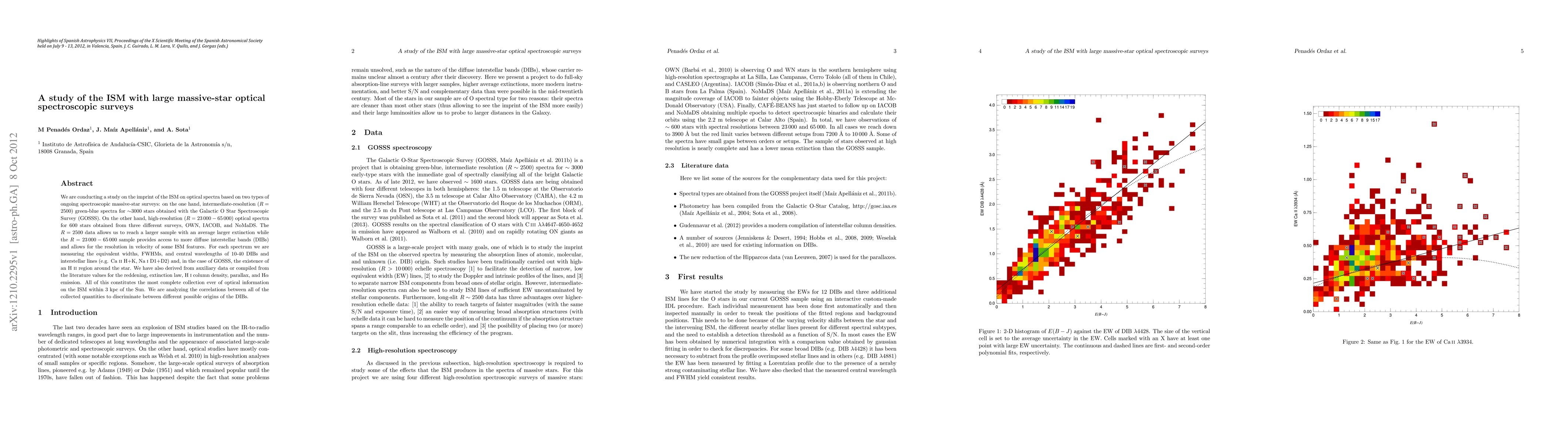 We are conducting a study on the imprint of the ISM on optical spectra based on two types of ongoing spectroscopic massive-star surveys: on the one hand, intermediate-resolution (R = 2500) green-blue spectra for ~3000 stars obtained with the Galactic O Star Spectroscopic Survey (GOSSS). On the other hand, high-resolution (R = 23 000 - 65 000) optical spectra for 600 stars obtained from three different surveys, OWN, IACOB, and NoMaDS. The R = 2500 data allows us to reach a larger sample with an average larger extinction while the R = 23 000 - 65 000 sample provides access to more diffuse interstellar bands (DIBs) and allows for the resolution in velocity of some ISM features. For each spectrum we are measuring the equivalent widths, FWHMs, and central wavelengths of 10-40 DIBs and interstellar lines (e.g. Ca II H+K, Na I D1+D2) and, in the case of GOSSS, the existence of an H II region around the star. We have also derived from auxiliary data or compiled from the literature values for the reddening, extinction law, H I column density, parallax, and H alpha emission. All of this constitutes the most complete collection ever of optical information on the ISM within 3 kpc of the Sun. We are analyzing the correlations between all of the collected quantities to discriminate between different possible origins of the DIBs.