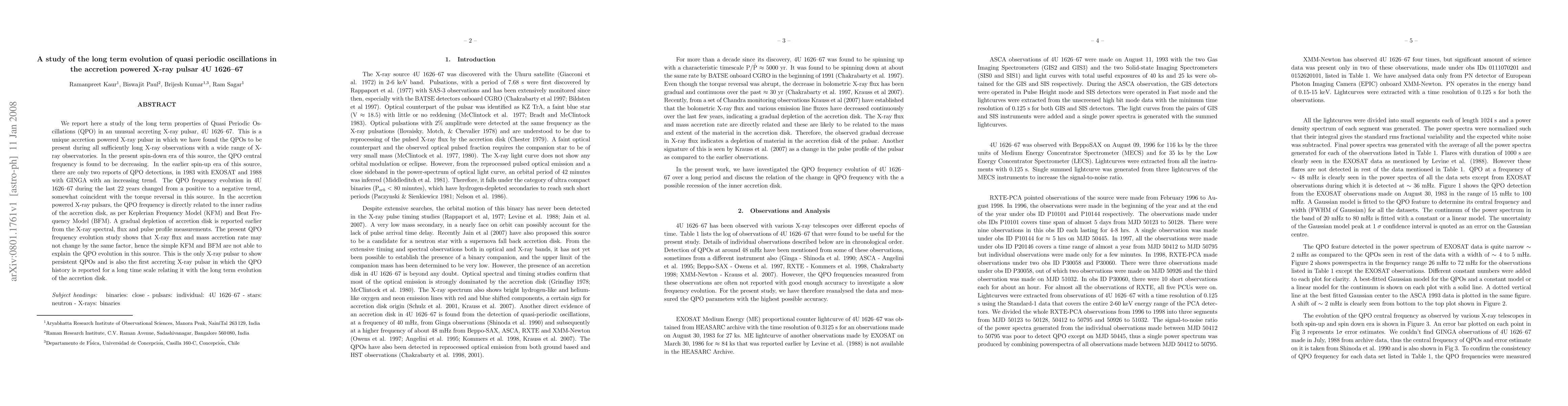 We report here a study of the long term properties of Quasi Periodic Oscillations (QPO) in an unusual accreting X-ray pulsar, 4U 1626--67. This is a unique accretion powered X-ray pulsar in which we have found the QPOs to be present during all sufficiently long X-ray observations with a wide range of X-ray observatories. In the present spin-down era of this source, the QPO central frequency is found to be decreasing. In the earlier spin-up era of this source, there are only two reports of QPO detections, in 1983 with EXOSAT and 1988 with GINGA with an increasing trend. The QPO frequency evolution in 4U 1626--67 during the last 22 years changed from a positive to a negative trend, somewhat coincident with the torque reversal in this source. In the accretion powered X-ray pulsars, the QPO frequency is directly related to the inner radius of the accretion disk, as per Keplerian Frequency Model (KFM) and Beat Frequency Model (BFM). A gradual depletion of accretion disk is reported earlier from the X-ray spectral, flux and pulse profile measurements. The present QPO frequency evolution study shows that X-ray flux and mass accretion rate may not change by the same factor, hence the simple KFM and BFM are not able to explain the QPO evolution in this source. This is the only X-ray pulsar to show persistent QPOs and is also the first accreting X-ray pulsar in which the QPO history is reported for a long time scale relating it with the long term evolution of the accretion disk.