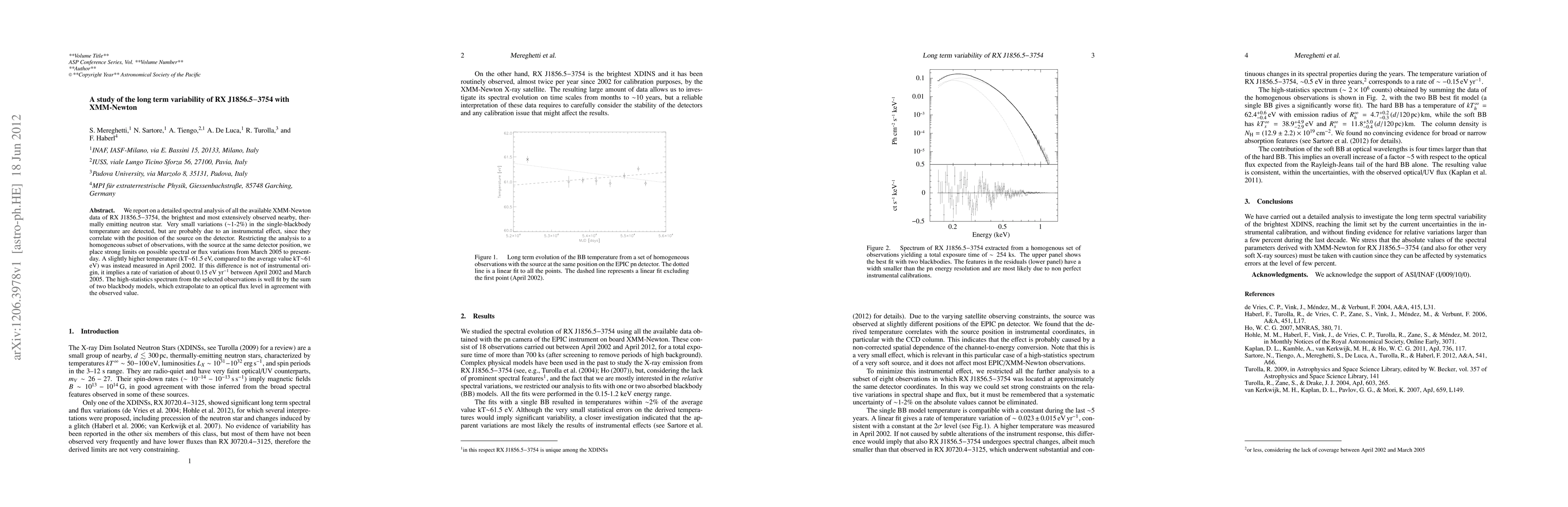 We report on a detailed spectral analysis of all the available XMM-Newton data of RX J1856.5-3754, the brightest and most extensively observed nearby, thermally emitting neutron star. Very small variations (~1-2%) in the single-blackbody temperature are detected, but are probably due to an instrumental effect, since they correlate with the position of the source on the detector. Restricting the analysis to a homogeneous subset of observations, with the source at the same detector position, we place strong limits on possible spectral or flux variations from March 2005 to present-day. A slightly higher temperature (kT~61.5 eV, compared to the average value kT~61 eV) was instead measured in April 2002. If this difference is not of instrumental origin, it implies a rate of variation of about 0.15 eV/yr between April 2002 and March 2005. The high-statistics spectrum from the selected observations is well fit by the sum of two blackbody models, which extrapolate to an optical flux level in agreement with the observed value.