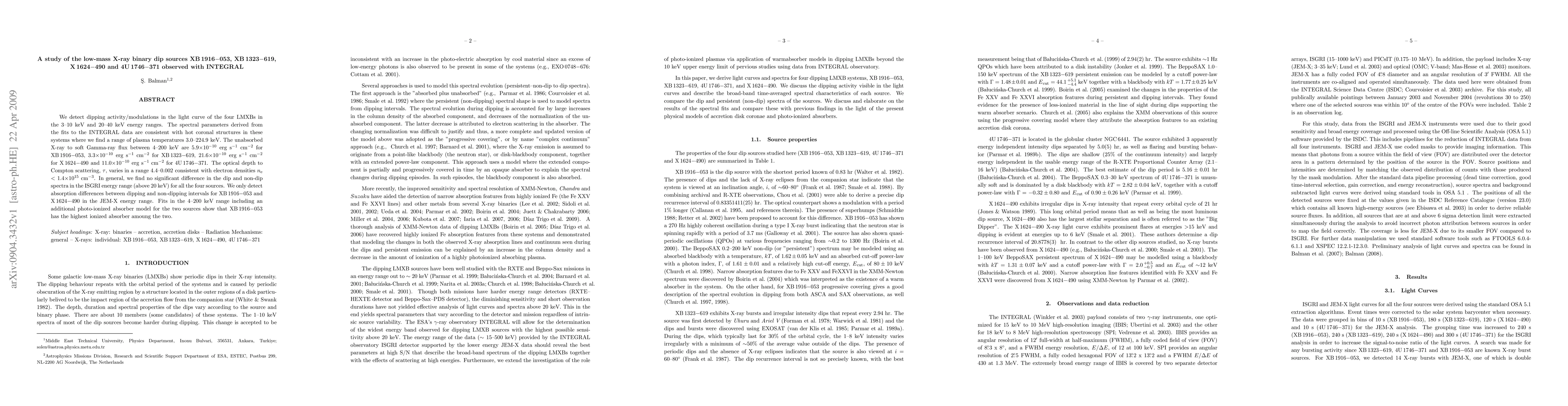 We detect dipping activity/modulations in the light curve of the four LMXBs in the 3--10 keV and 20--40 keV energy ranges. The spectral parameters derived from the fits to the INTEGRAL data are consistent with hot coronal structures in these systems where we find a range of plasma temperatures 3.0--224.9 keV. The unabsorbed X-ray to soft Gamma-ray flux between 4--200 keV are 5.9$\times 10^{-10}$ erg s$^{-1}$ cm$^{-2}$ for XB 1916-053, 3.3$\times 10^{-10}$ erg s$^{-1}$ cm$^{-2}$ for XB 1323-619, 21.6$\times 10^{-10}$ erg s$^{-1}$ cm$^{-2}$ for X 1624-490 and 11.0$\times 10^{-10}$ erg s$^{-1}$ cm$^{-2}$ for 4U 1746-371. The optical depth to Compton scattering, $\tau$, varies in a range 4.4--0.002 consistent with electron densities $n_e$ $<$ 1.4$\times 10^{15}$ cm$^{-3}$. In general, we find no significant difference in the dip and non-dip spectra in the ISGRI energy range (above 20 keV) for all the four sources. We only detect absorption differences between dipping and non-dipping intervals for XB 1916-053 and X 1624-490 in the JEM-X energy range. Fits in the 4--200 keV range including an additional photo-ionized absorber model for the two sources show that XB 1916-053 has the highest ionized absorber amoung the two.